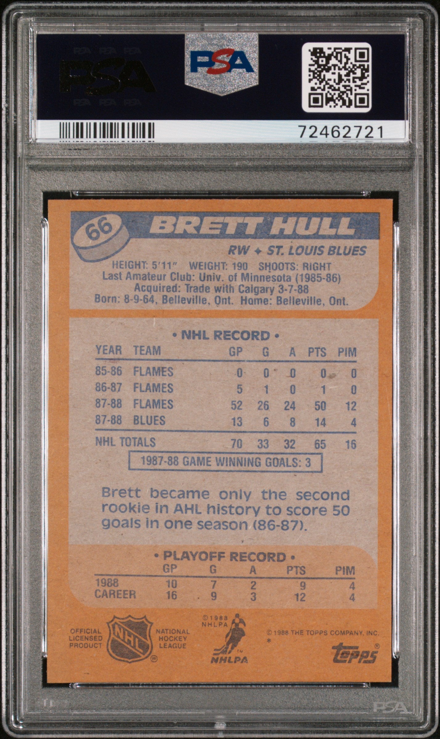 You are purchasing a 1988 Topps Brett Hull #66 PSA 8. You will receive the exact item in the photographs. Thank you for looking. Listed With Mascot.