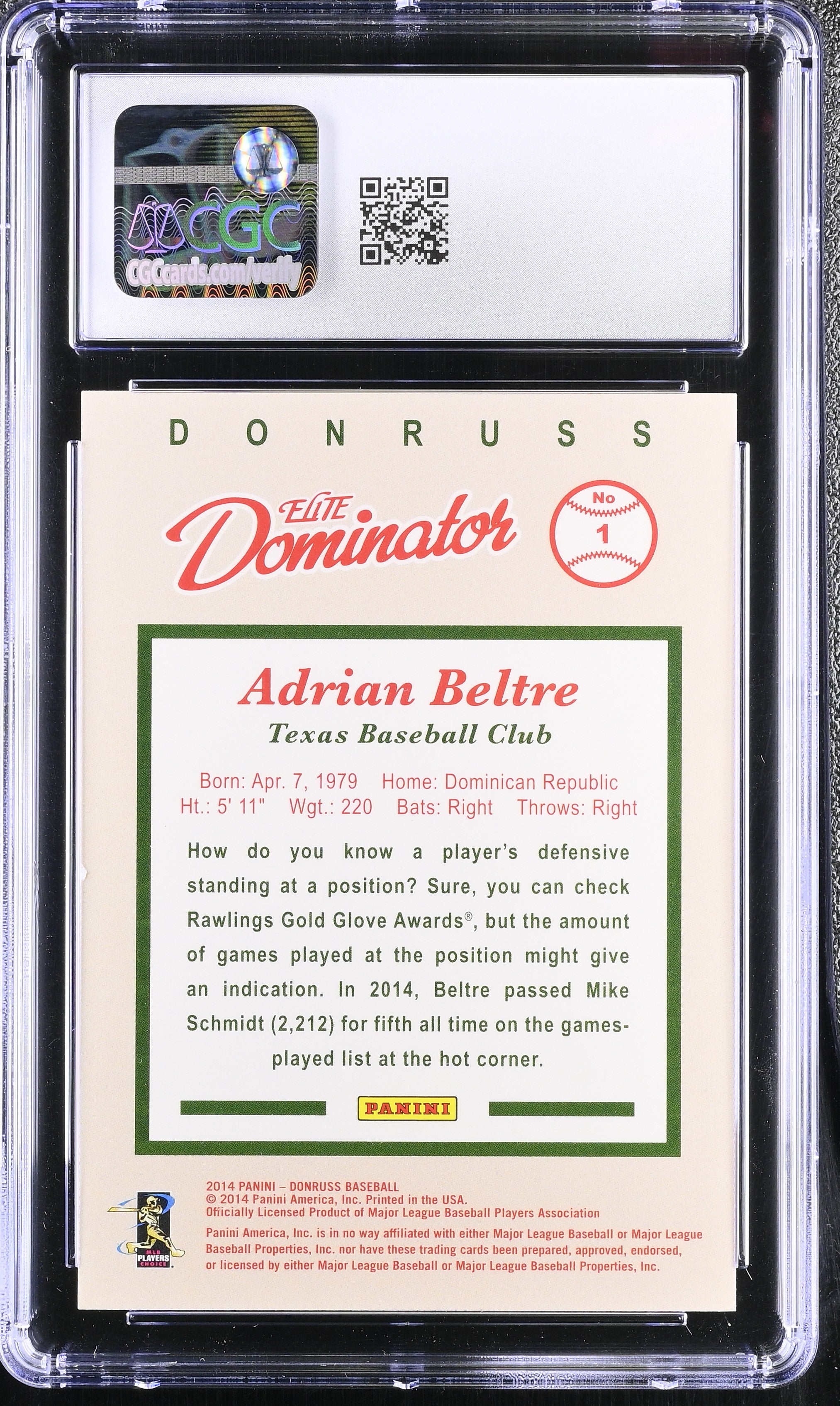2014 Donruss Adrian Beltre #1 Elite Dominator Series 2 CGC 10