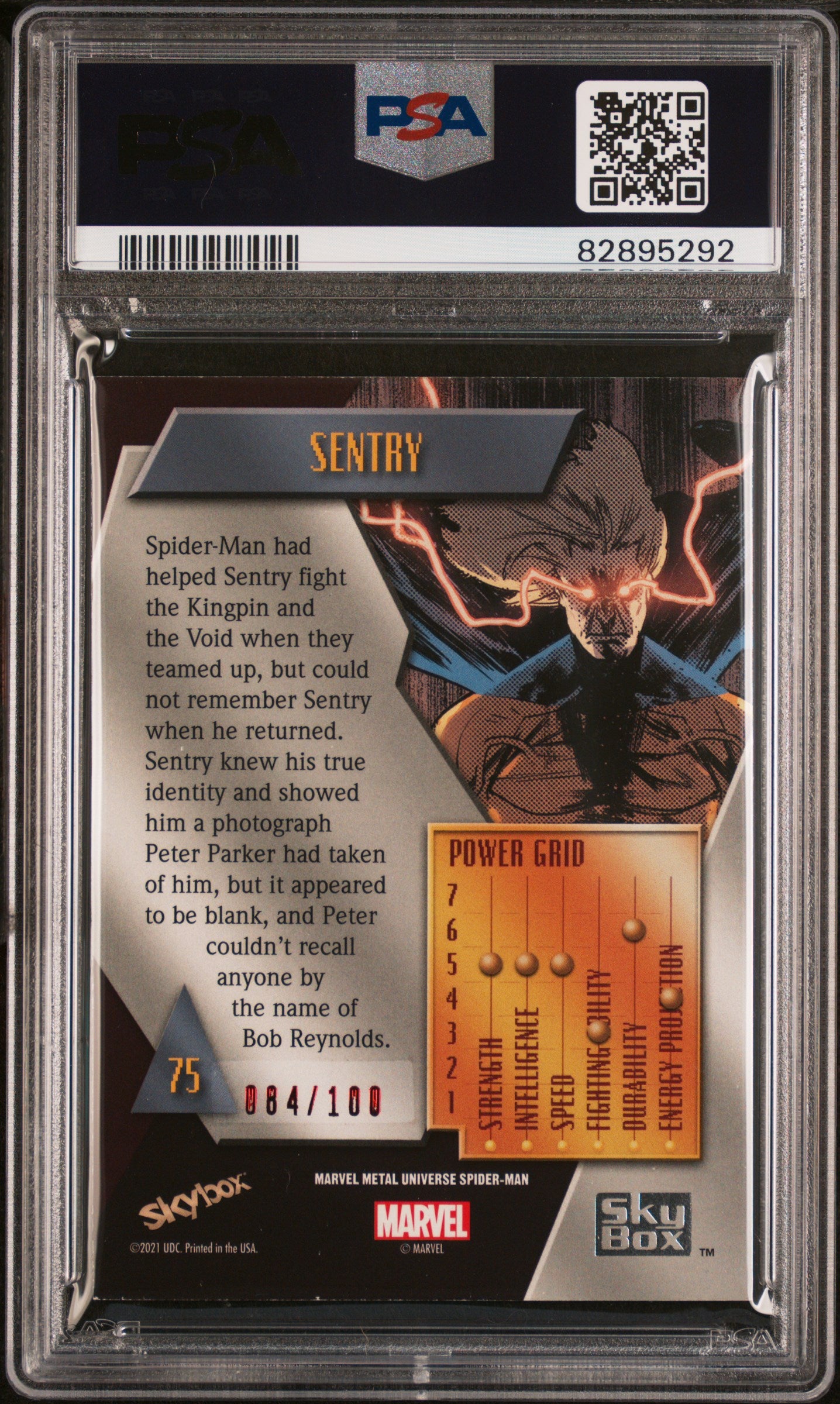 You are purchasing a 2022 Skybox Marvel Metal Universe Spider-Man Sentry #75 PSA 7. You will receive the exact item in the photographs. Thank you for looking. Listed With Mascot.