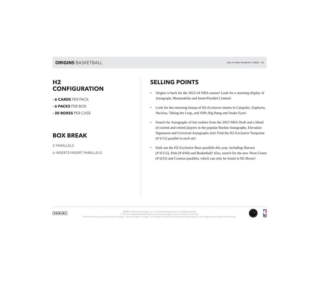 Origins is back for the 2023-24 NBA season! Look for a stunning display of Autograph, Memorabilia and Insert/Parallel Content!