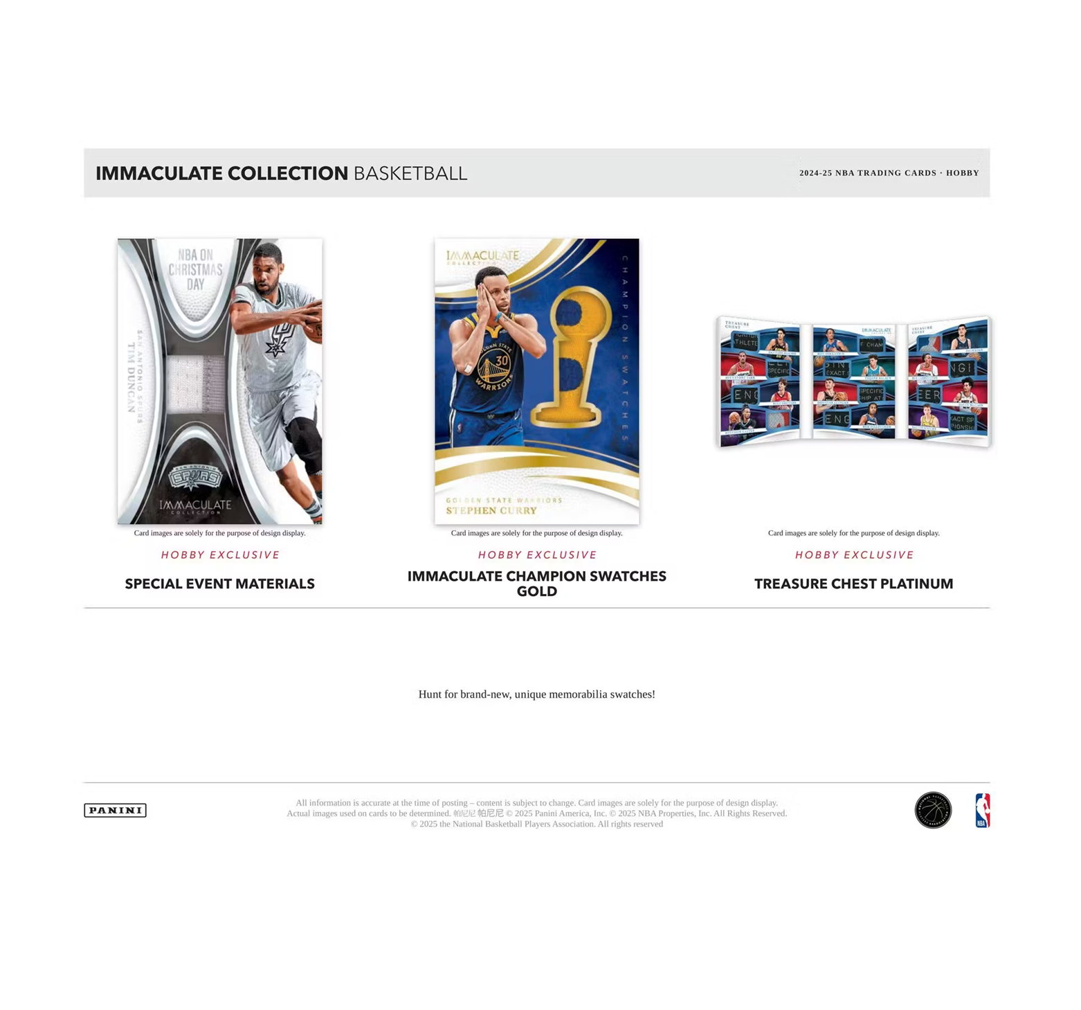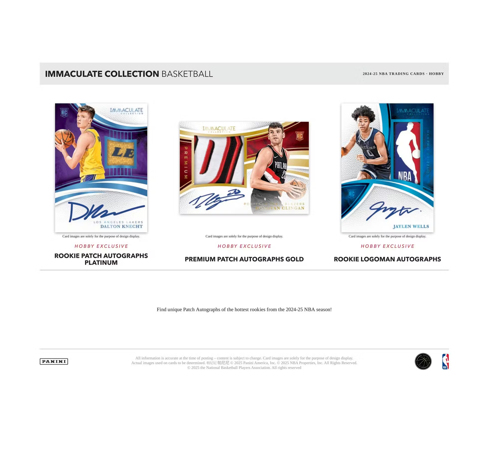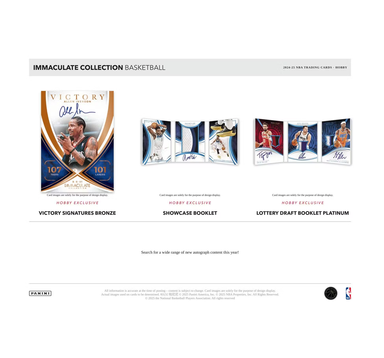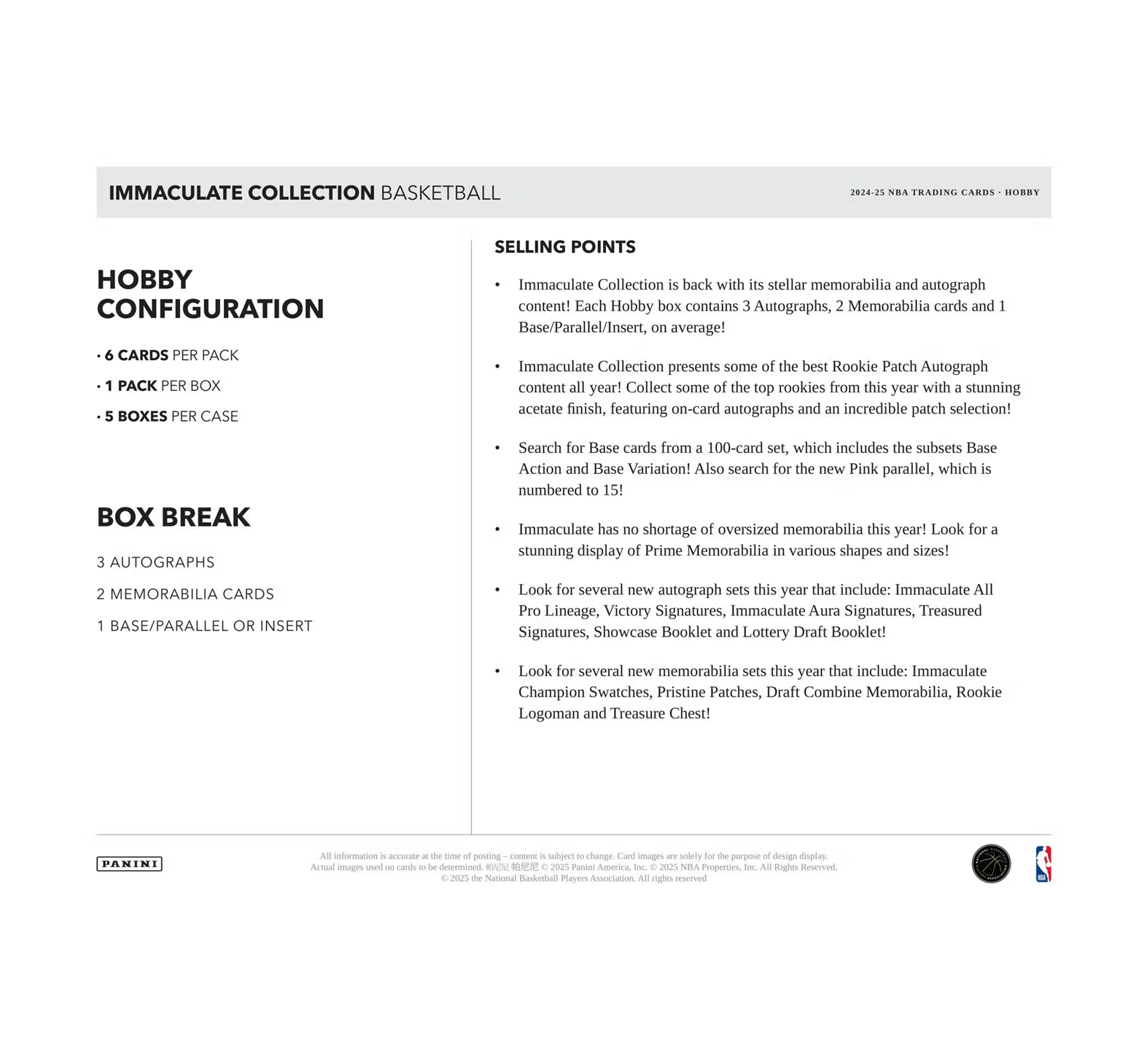 Open a 2024-25 Panini Immaculate Basketball Hobby Box for a premium rip! Each box delivers 3 autographs and 2 memorabilia cards on average. Hunt for stunning Rookie Patch Autographs, rare Logoman relics, and unique booklet cards. Free shipping on orders over $200.