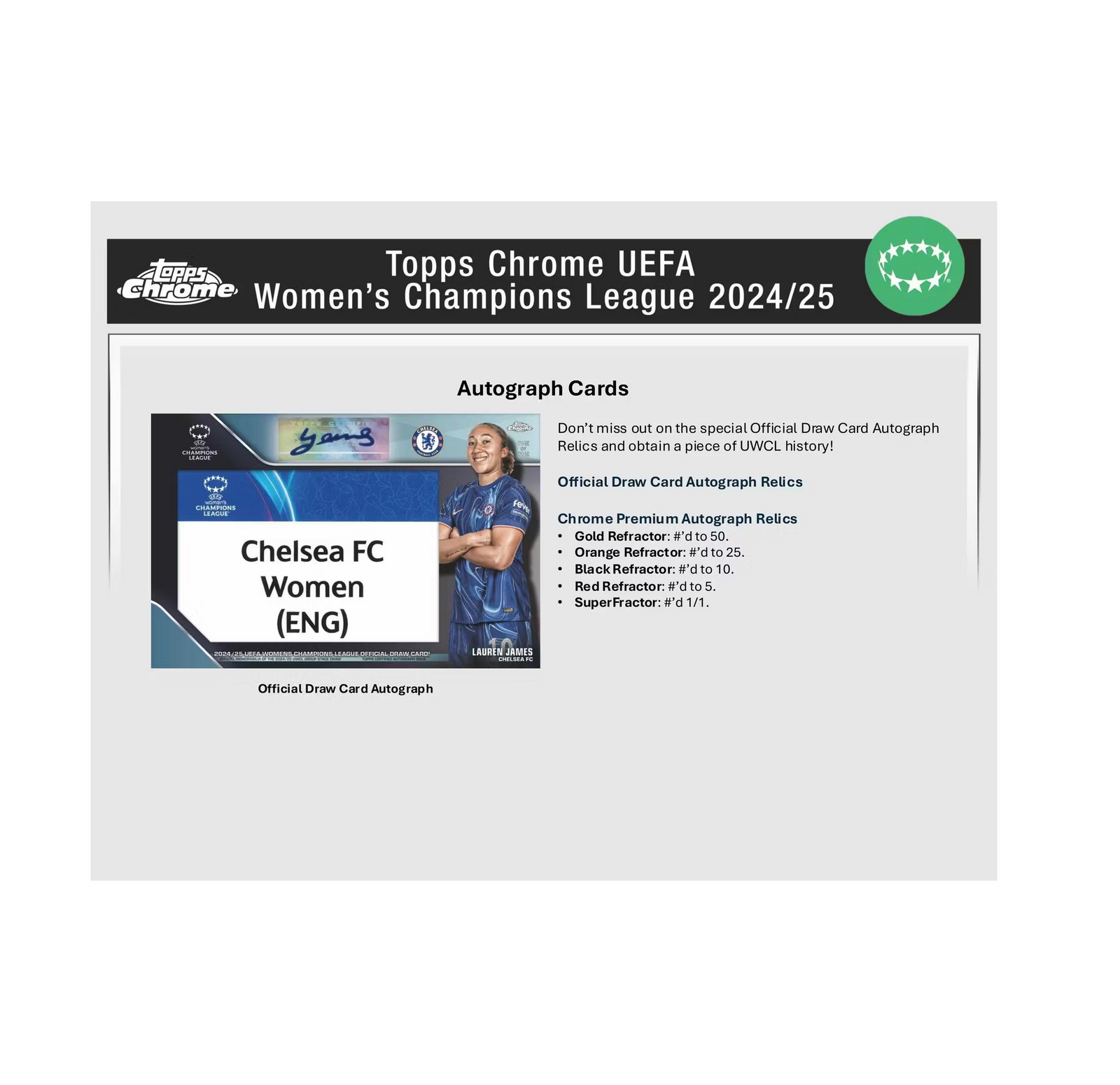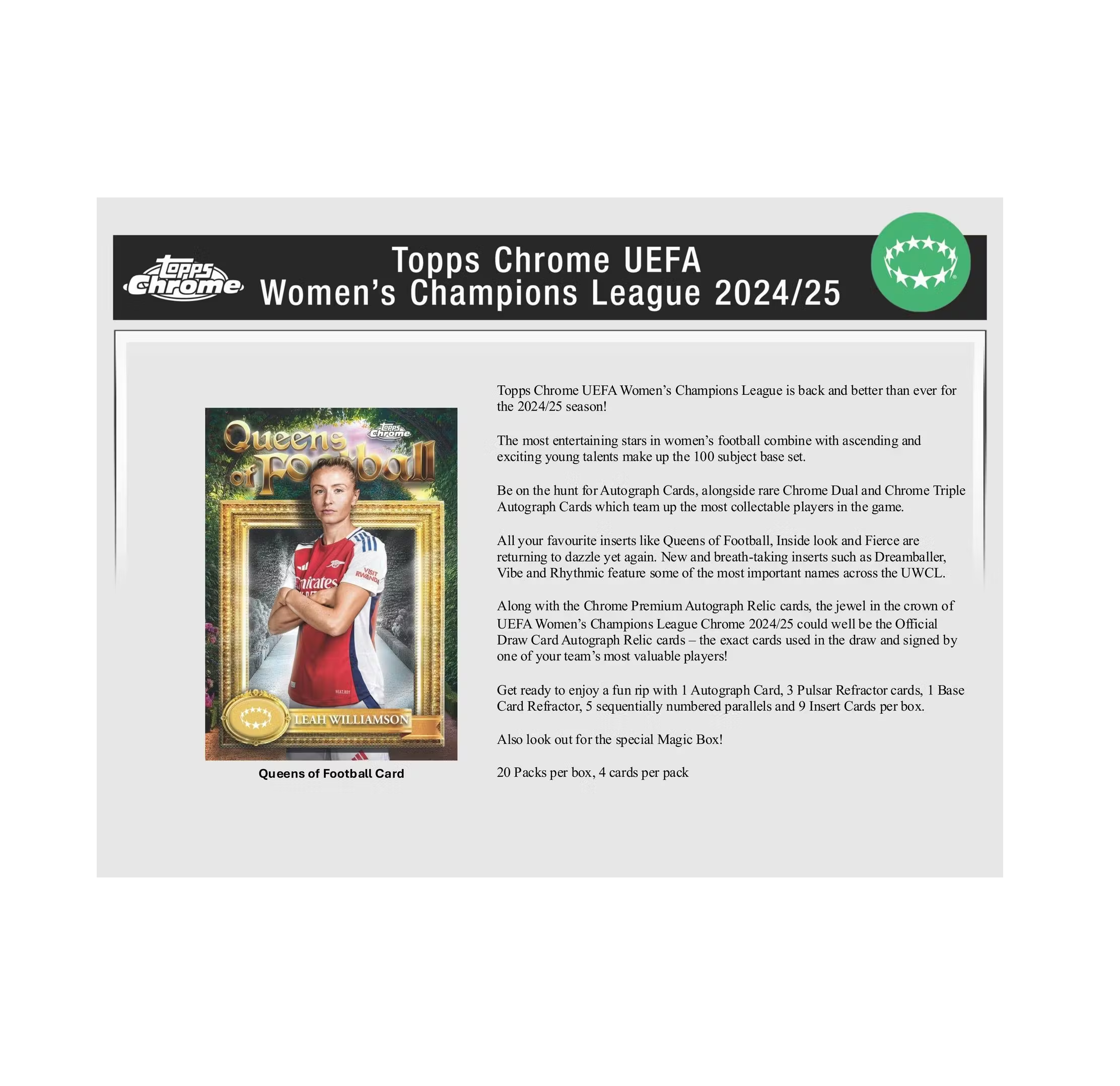 2024-25 Topps Chrome UEFA Women's Champions League Soccer Hobby Box Experience the 2024-25 Topps Chrome UEFA Women's Champions League Hobby Box, featuring a premium 100-card base set of elite stars and rookies. Each box delivers one guaranteed autograph, three Pulsar Refractors, and more!