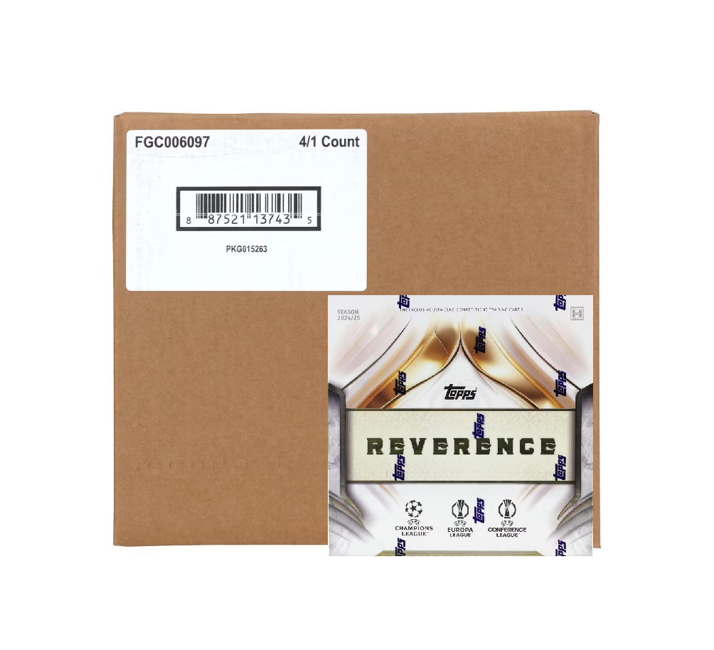2024-25 Topps UEFA Club Competitions Reverence Soccer Hobby 4-Box Case delivers four premium hobby boxes, each with three encased autographs (including a Crowned Legend), two numbered base parallels, and one autograph relic featuring global legends, stars, and rookies. Free shipping on orders over $200.