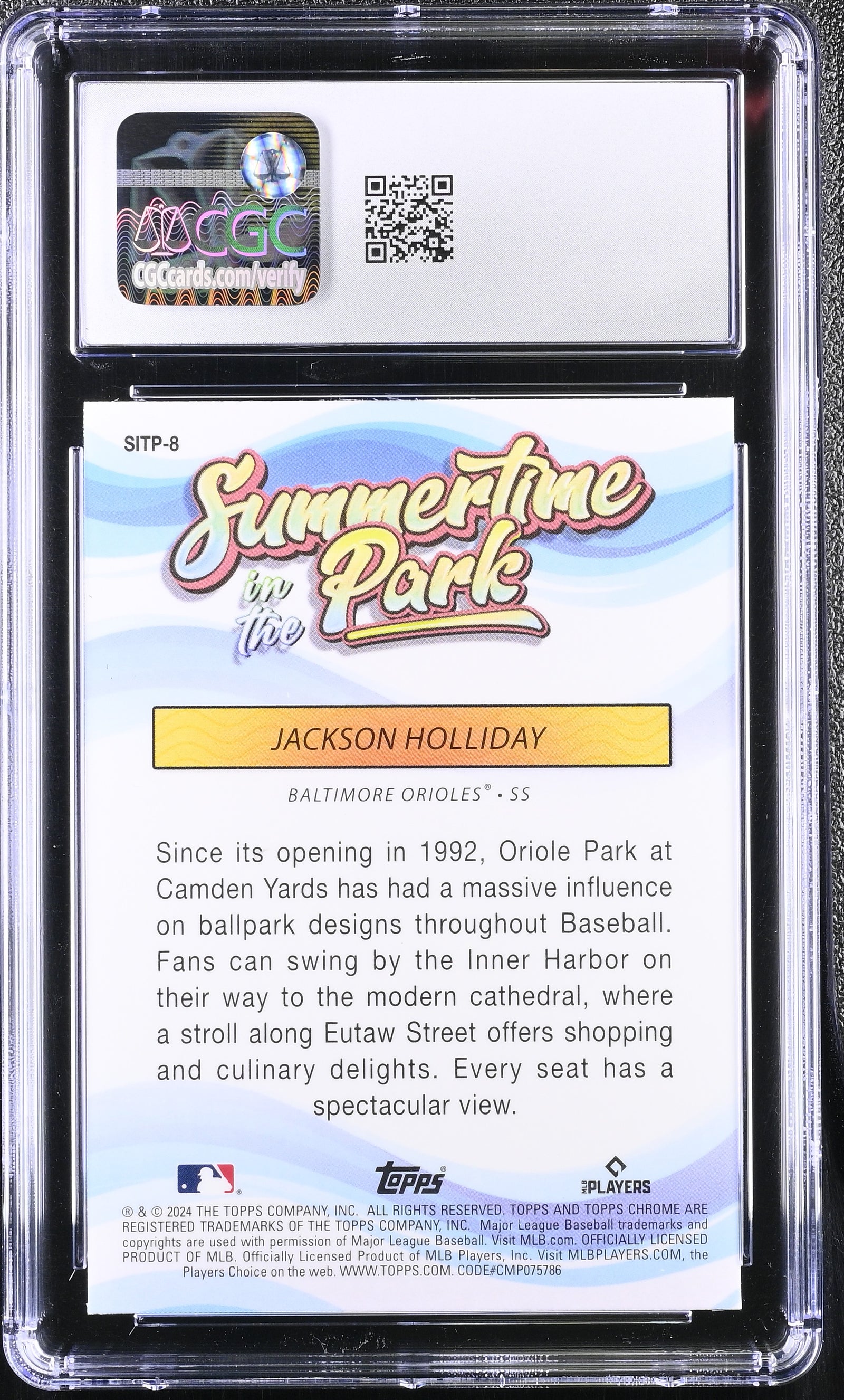 You are purchasing a 2024 Topps Chrome Jackson Holliday #SITP-8 Summertime in the Park CGC 10. You will receive the exact card in the photographs. Thank you for looking. Listed With Mascot.
