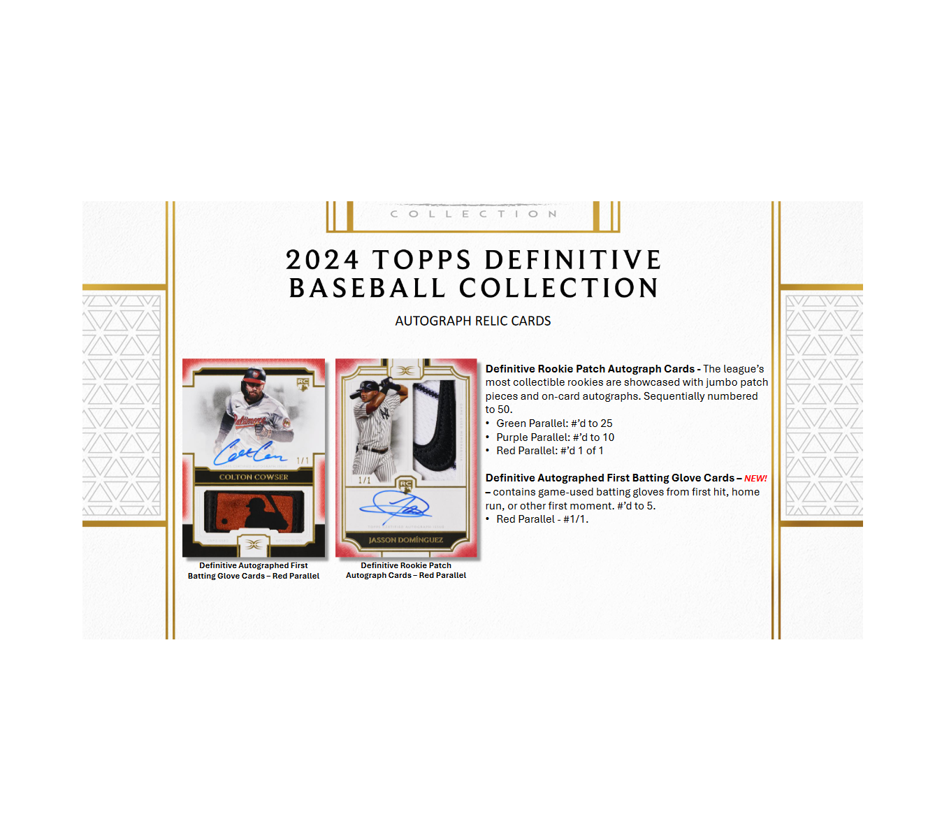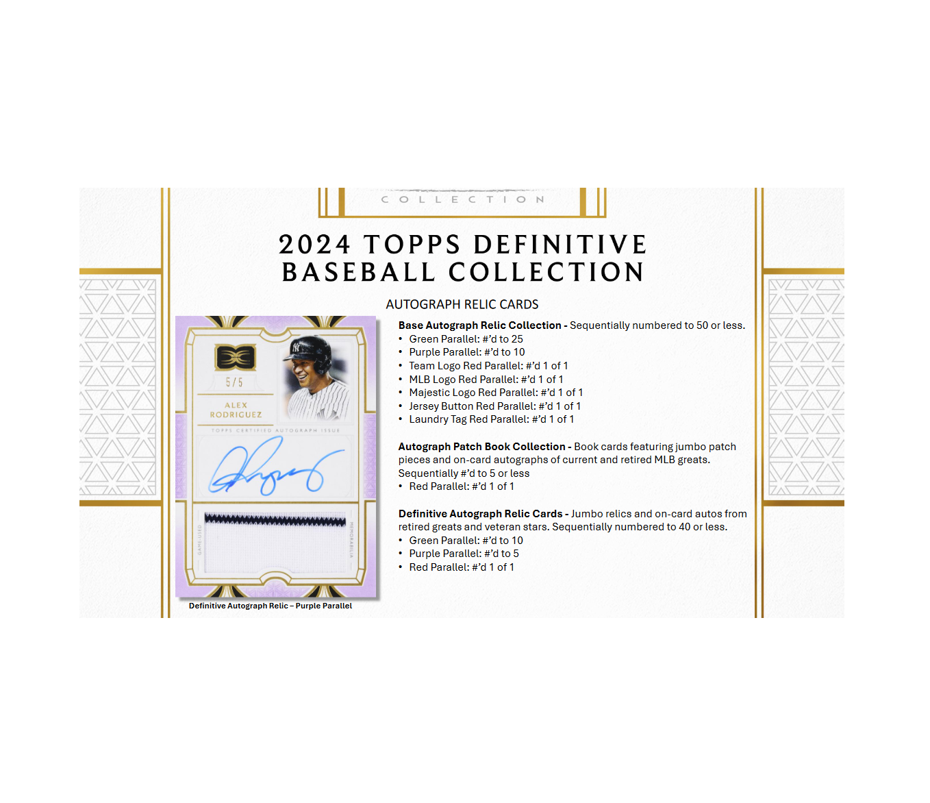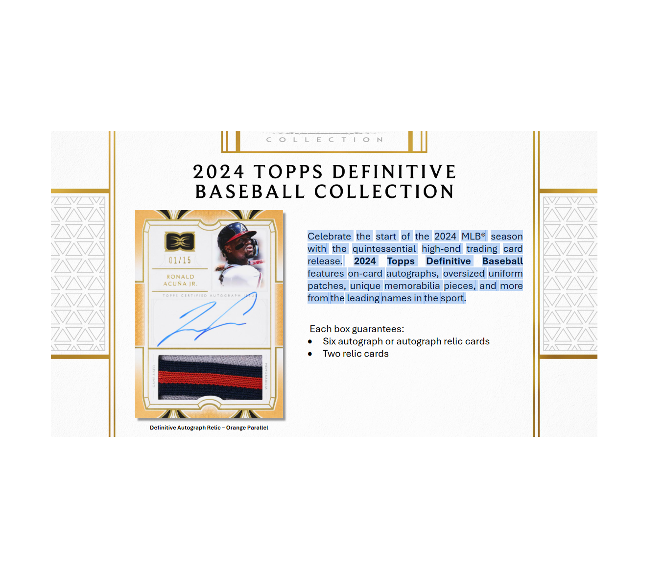 Celebrate the start of the 2024 MLB® season with the quintessential high-end trading card release. 2024 Topps Definitive Baseball features on-card autographs, oversized uniform patches, unique memorabilia pieces, and more from the leading names in the sport.