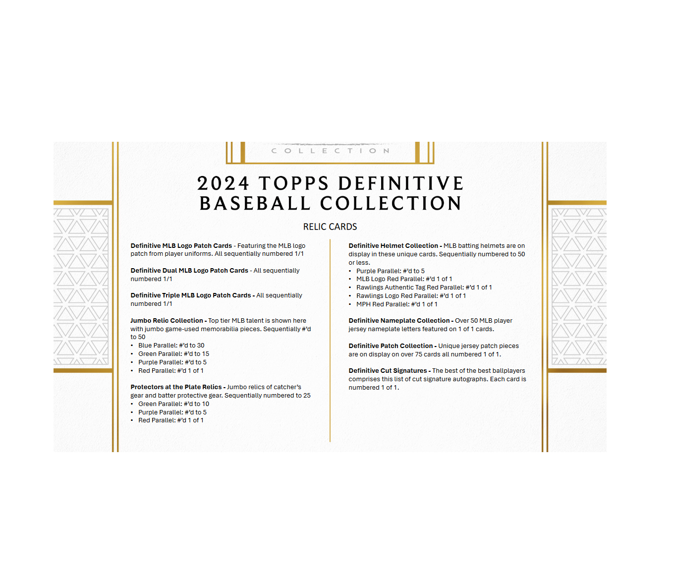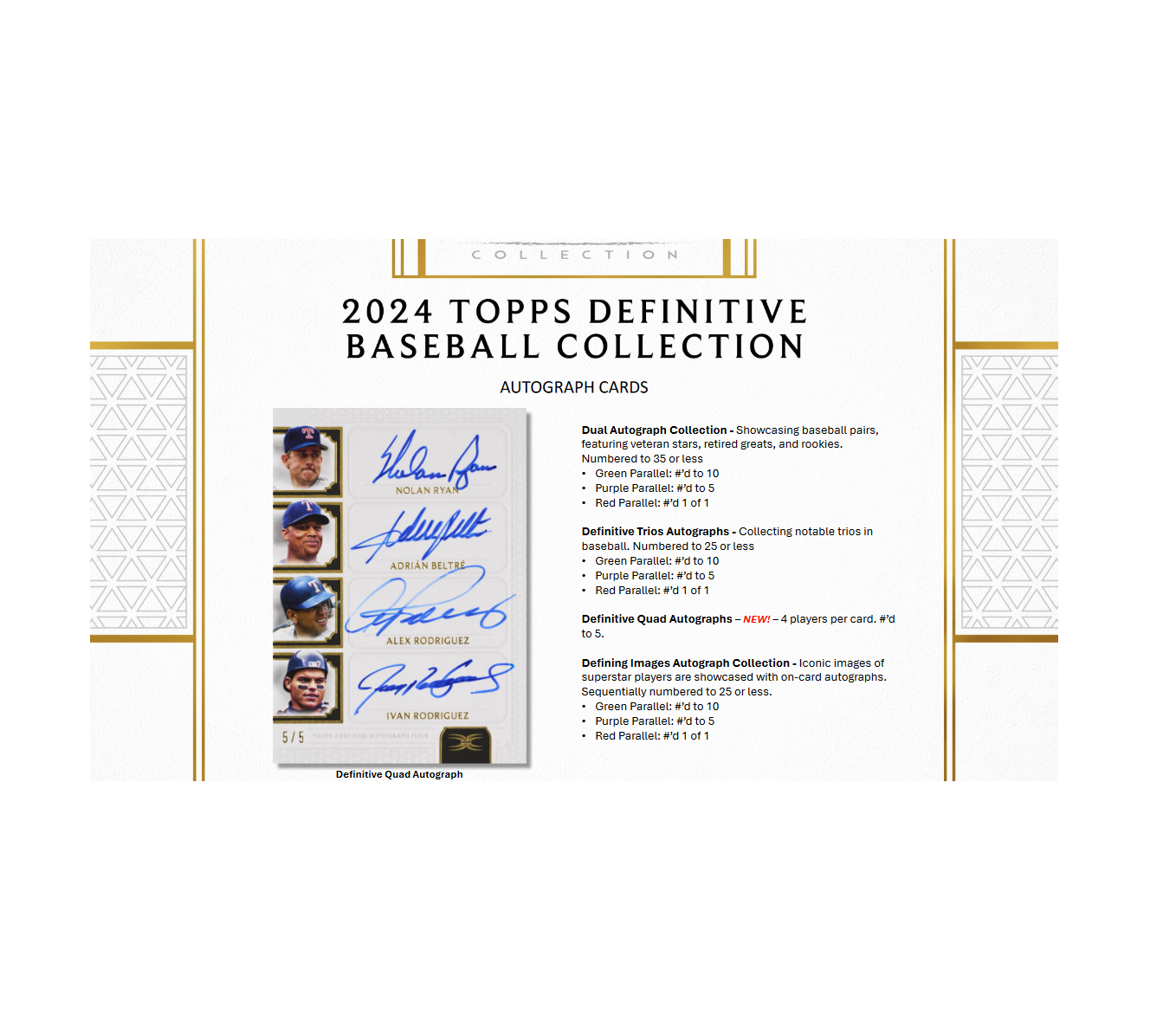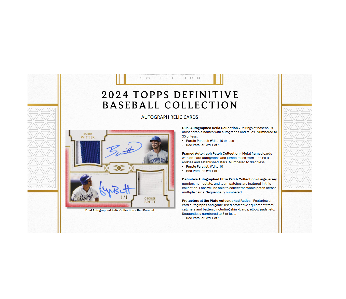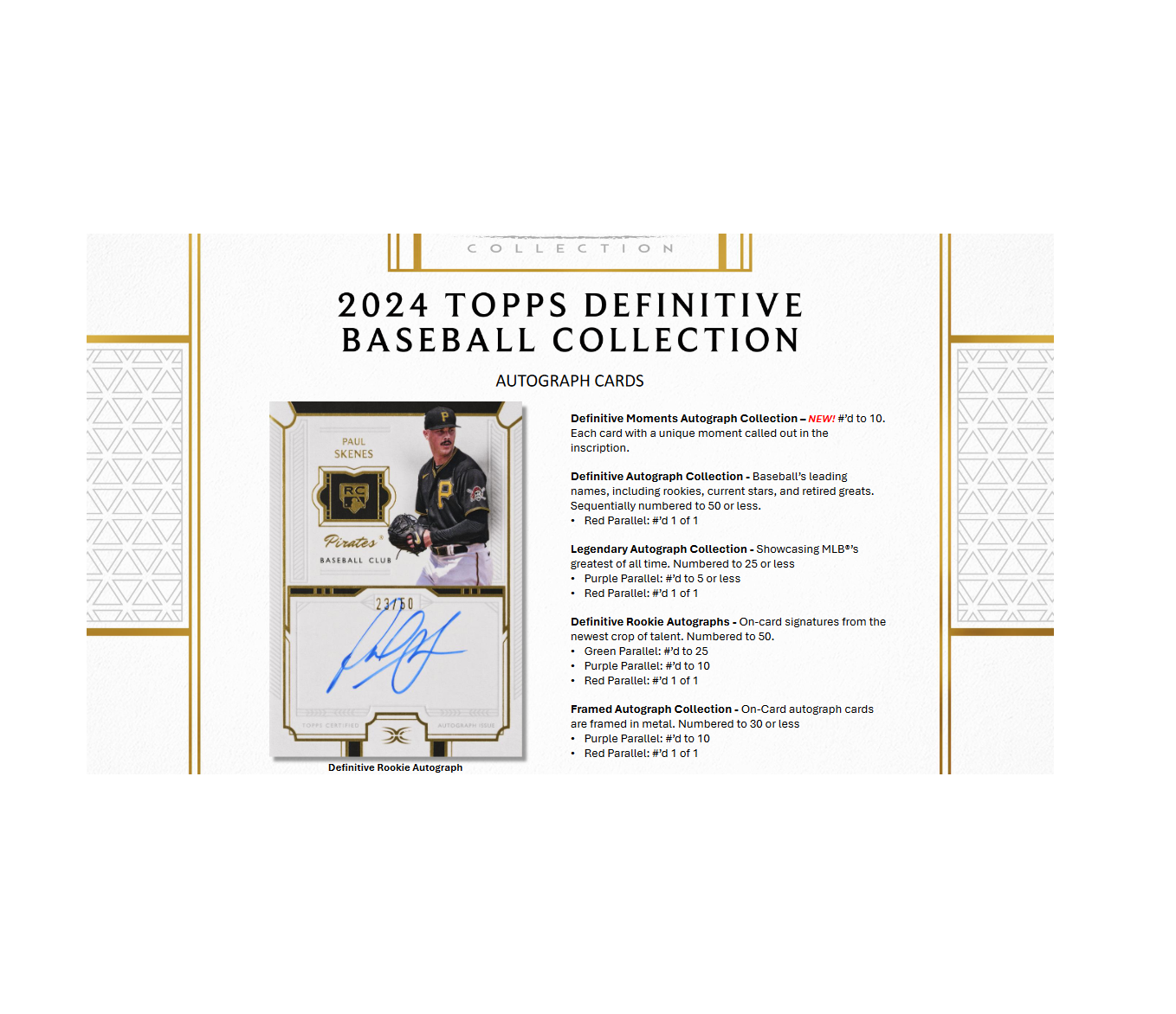 Celebrate the start of the 2024 MLB® season with the quintessential high-end trading card release. 2024 Topps Definitive Baseball features on-card autographs, oversized uniform patches, unique memorabilia pieces, and more from the leading names in the sport.
