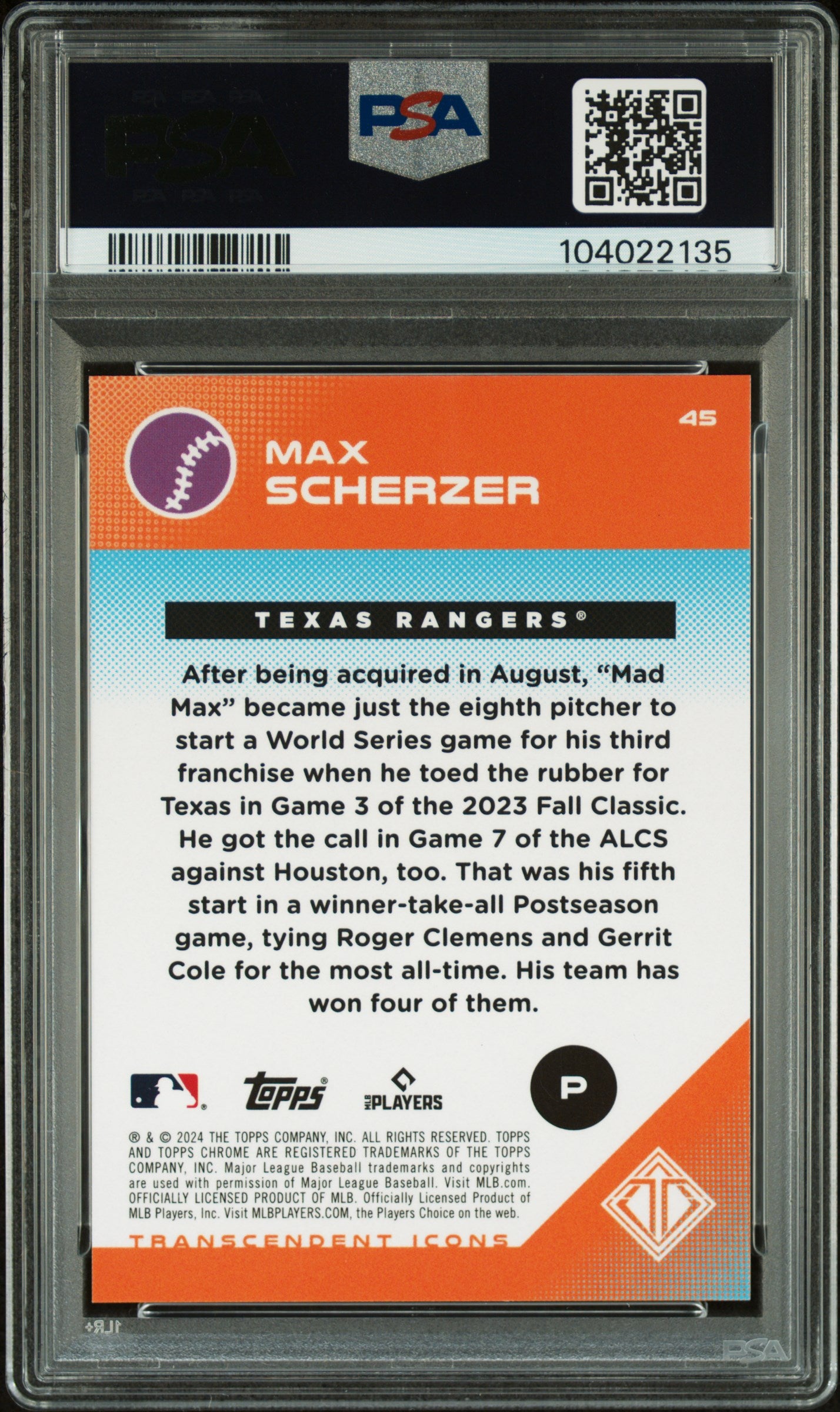 You are purchasing a 2024 Topps Transcendent Collection Transcendent Icons Chrome Max Scherzer #45 PSA 9. You will receive the exact card in the photographs. Thank you for looking. Listed With Mascot.