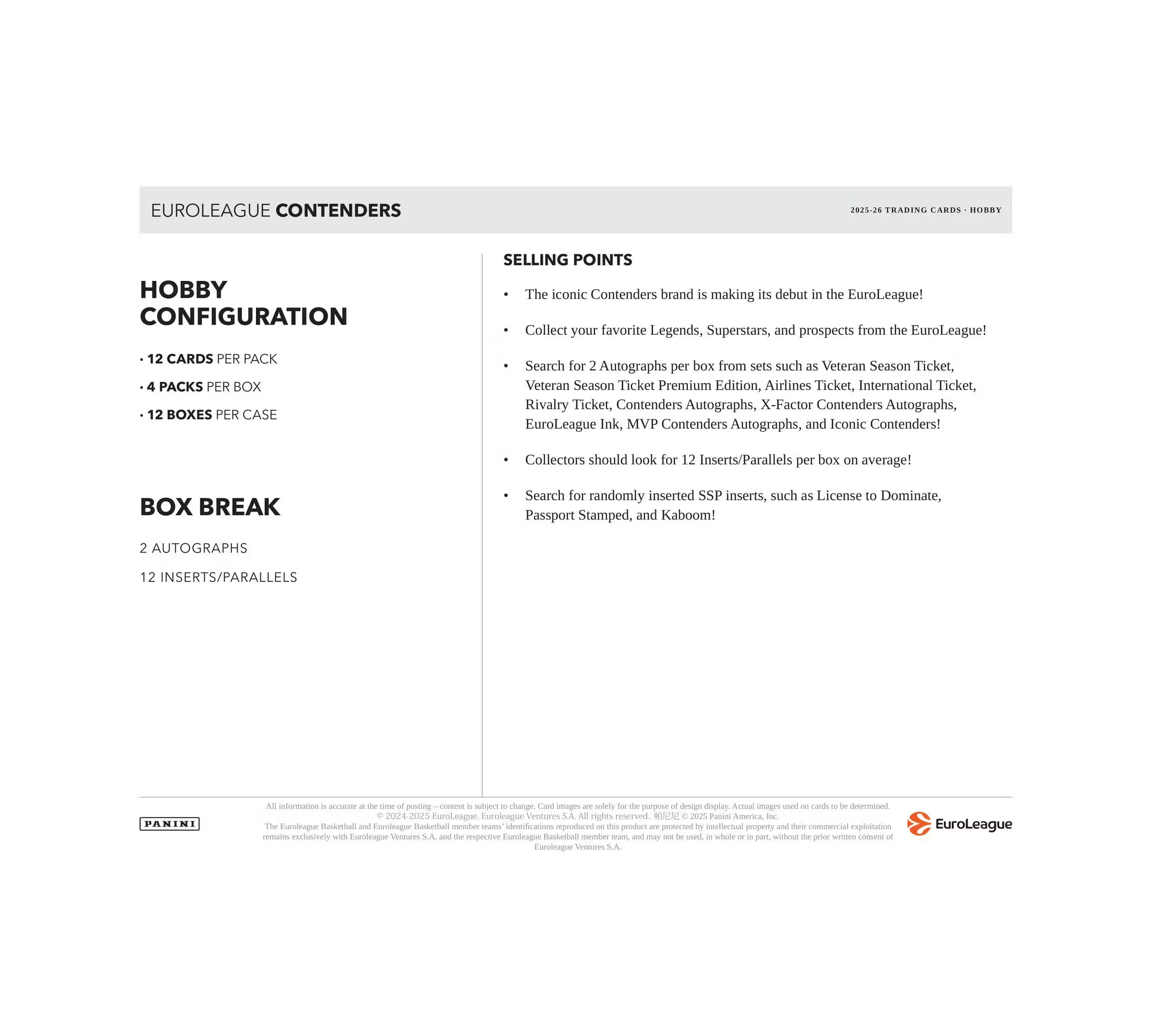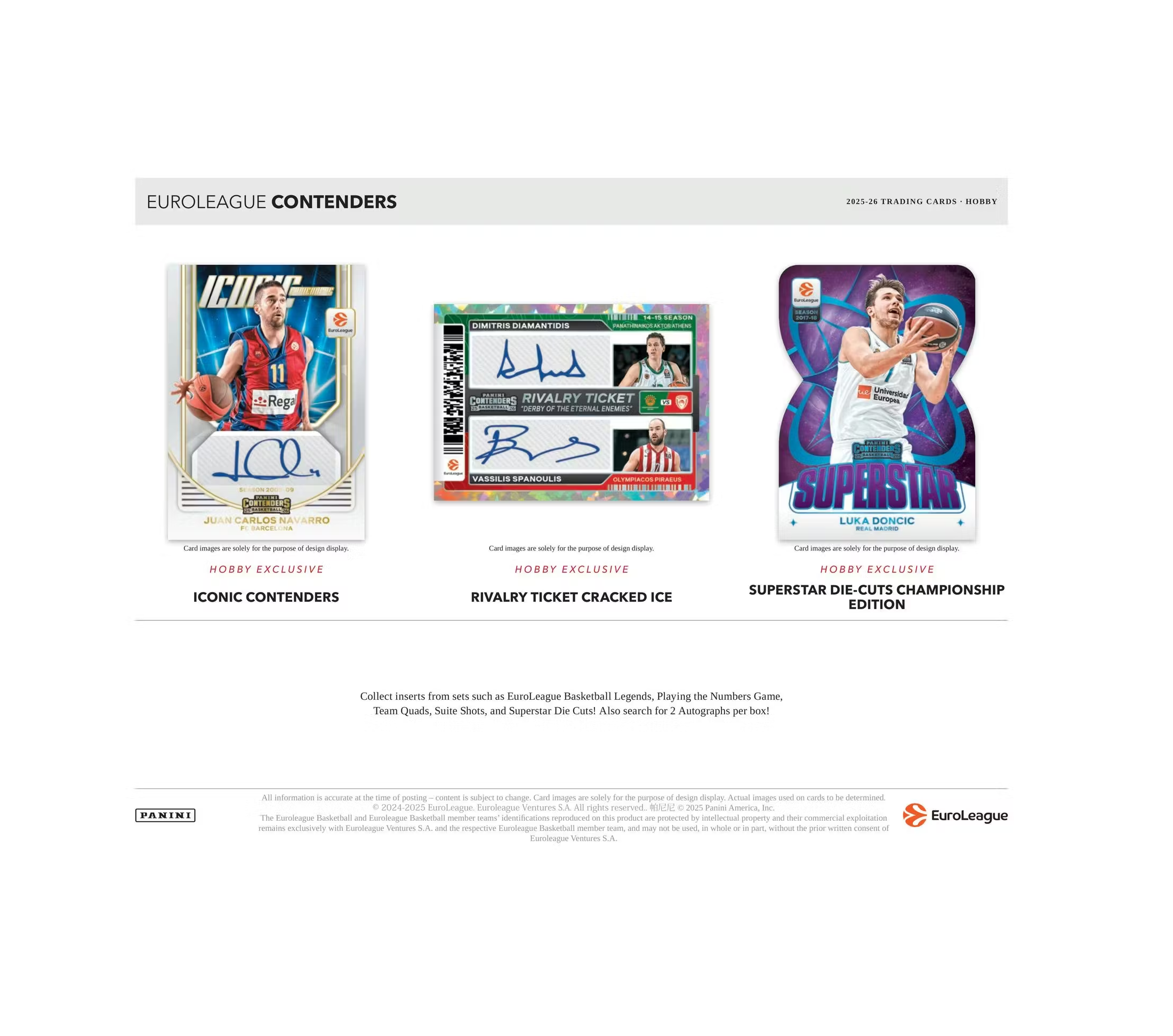 Search for 2 Autographs per box from sets such as Veteran Season Ticket, Veteran Season Ticket Premium Edition, Airlines Ticket, International Ticket, Rivalry Ticket, Contenders Autographs, X-Factor Contenders Autographs, EuroLeague Ink, MVP Contenders Autographs, and Iconic Contenders!