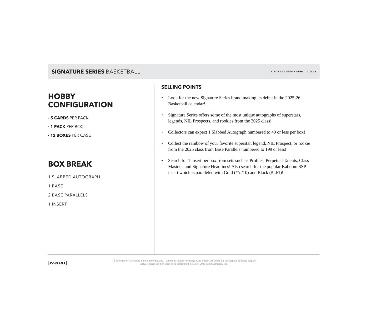 Chase the debut of the 2025-26 Panini Signature Series Basketball Hobby 12-Box Case! Each case delivers 12 slabbed autographs numbered to 49 or less, plus rare Kaboom! SSPs. Collect the next generation of stars and legends. Add this historic inaugural release to your collection at The Awesome Card Shop today!