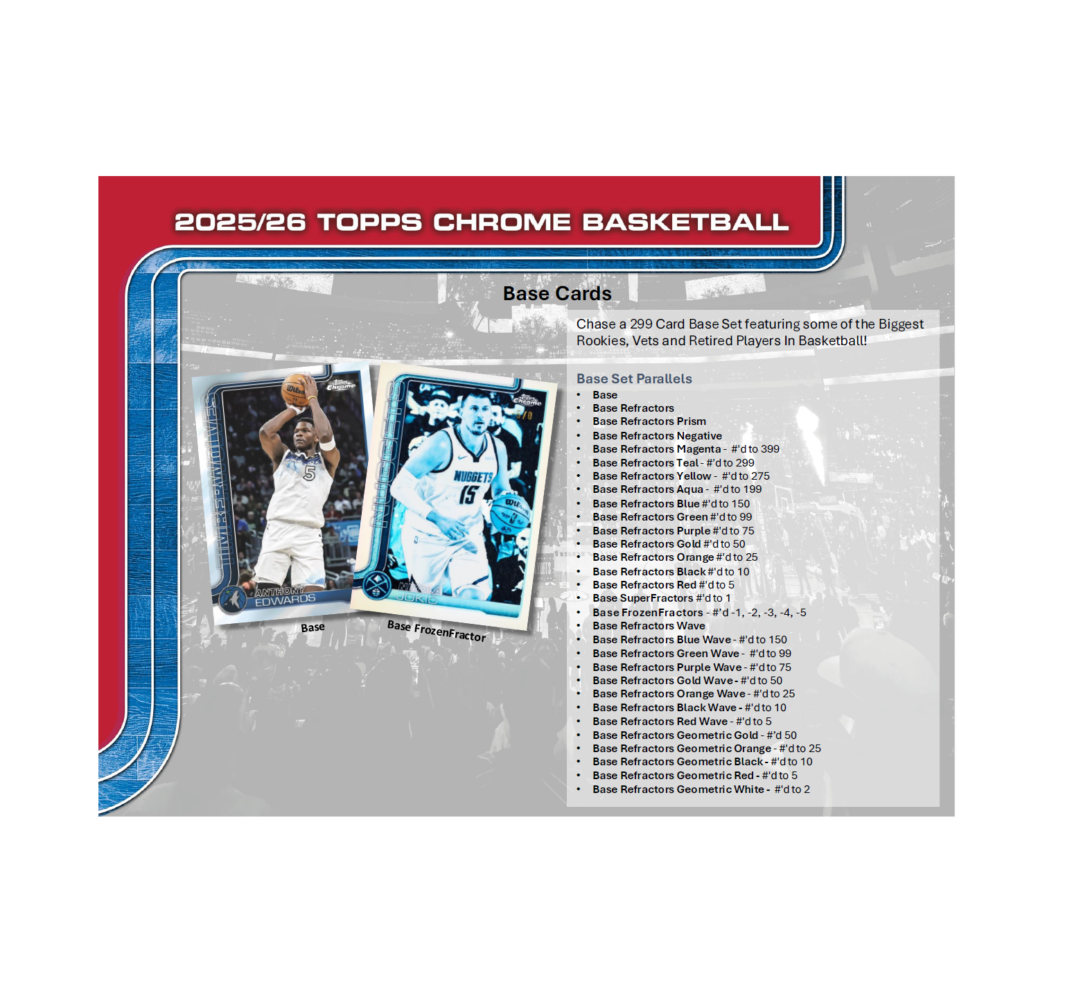 • Topps Chrome Basketball is back and better than ever! Build the full 299-card Base Set, bursting with a rainbow of color and tech parallels featuring the NBA’s top rookies, star veterans, and iconic legends!