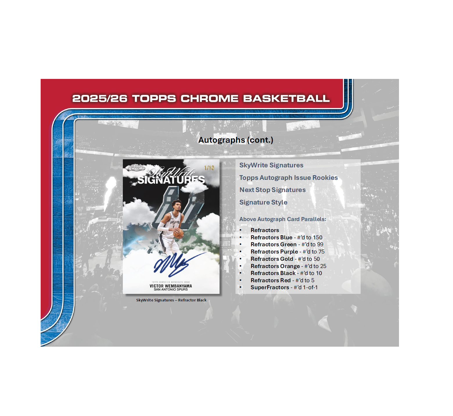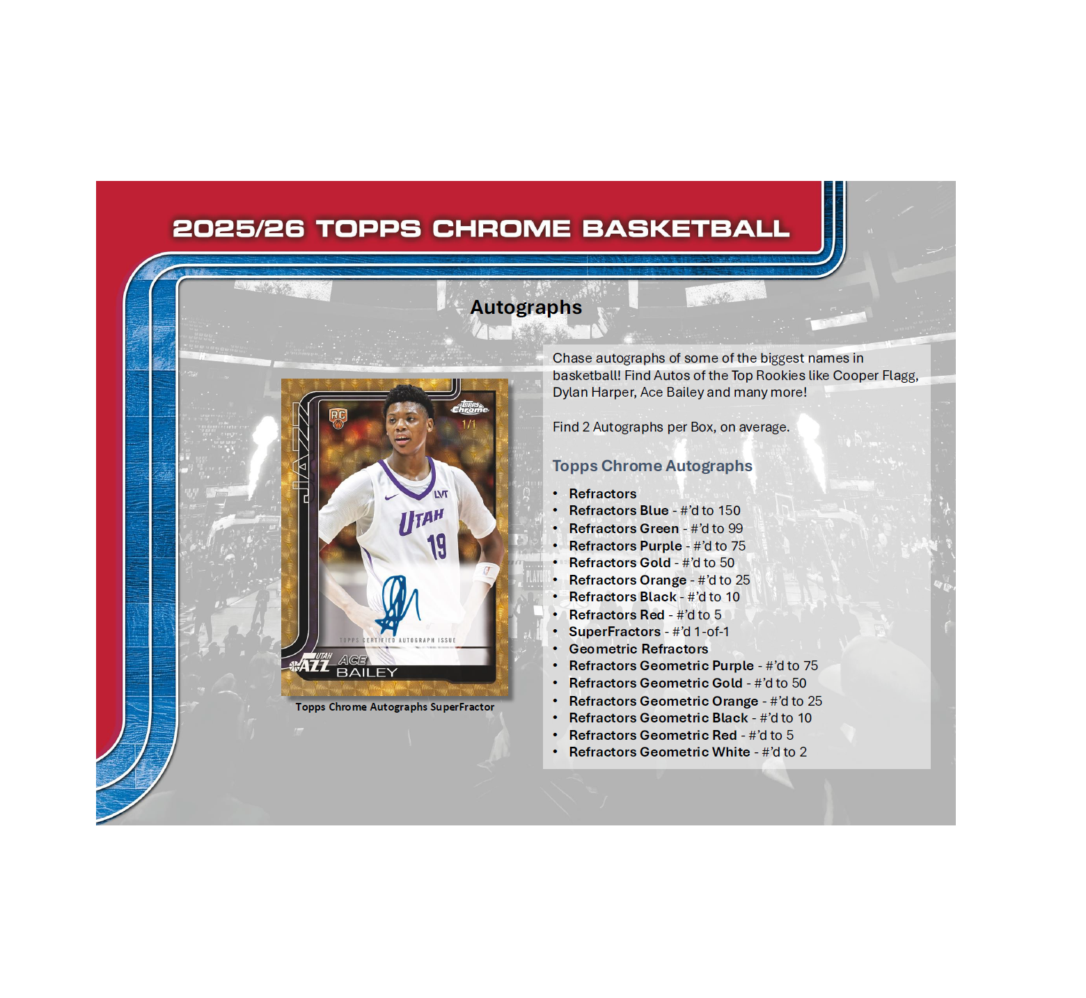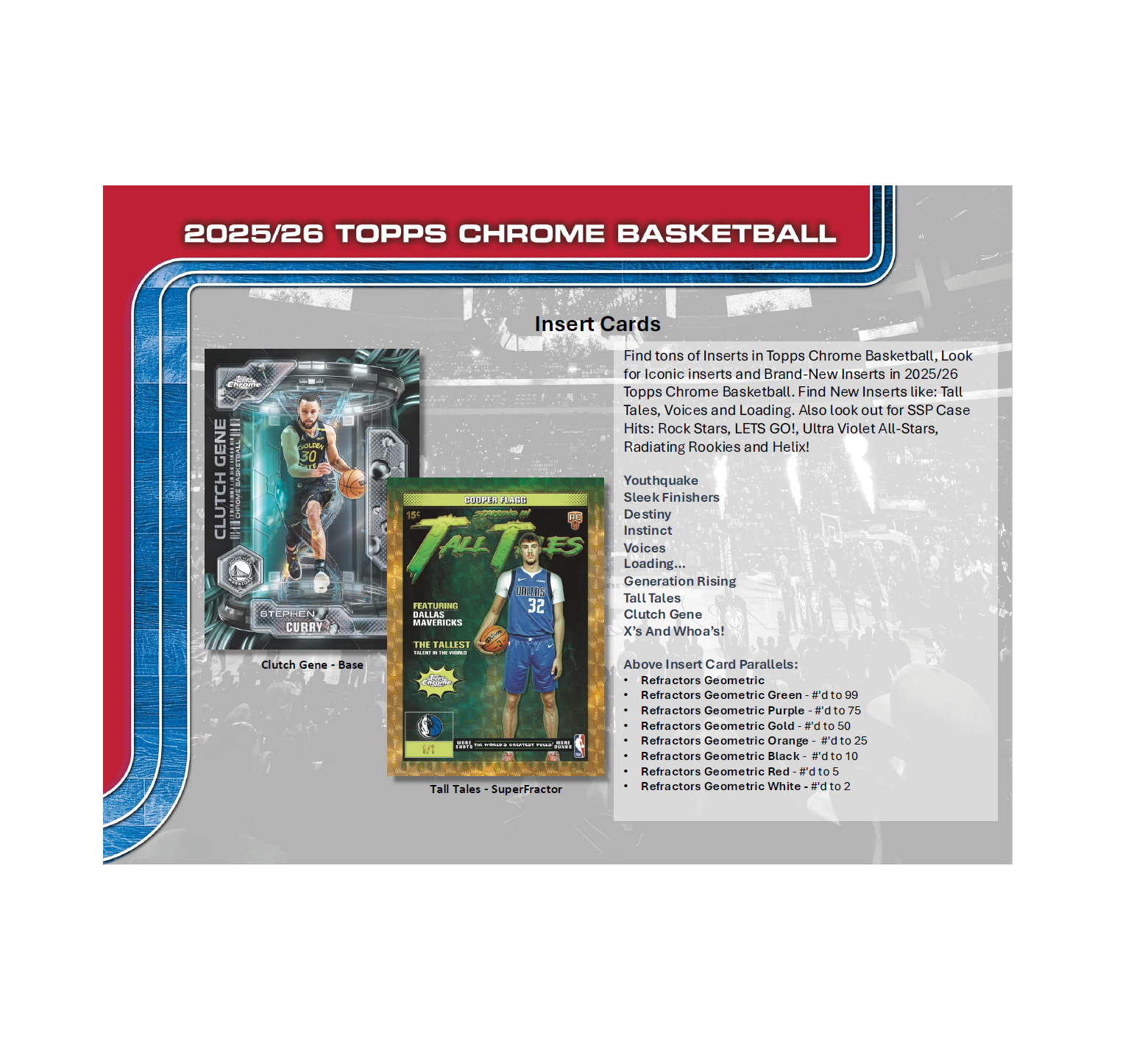 •  Introducing an all-new lineup of inserts, including Activators, Inspirational, Tall Tales and X's and Whoa's. Plus, chase autographs from some of the hottest names in the game—Cooper Flagg, Dylan Harper, Ace Bailey, LeBron James, Stephen Curry, Victor Wembanyama, and more!