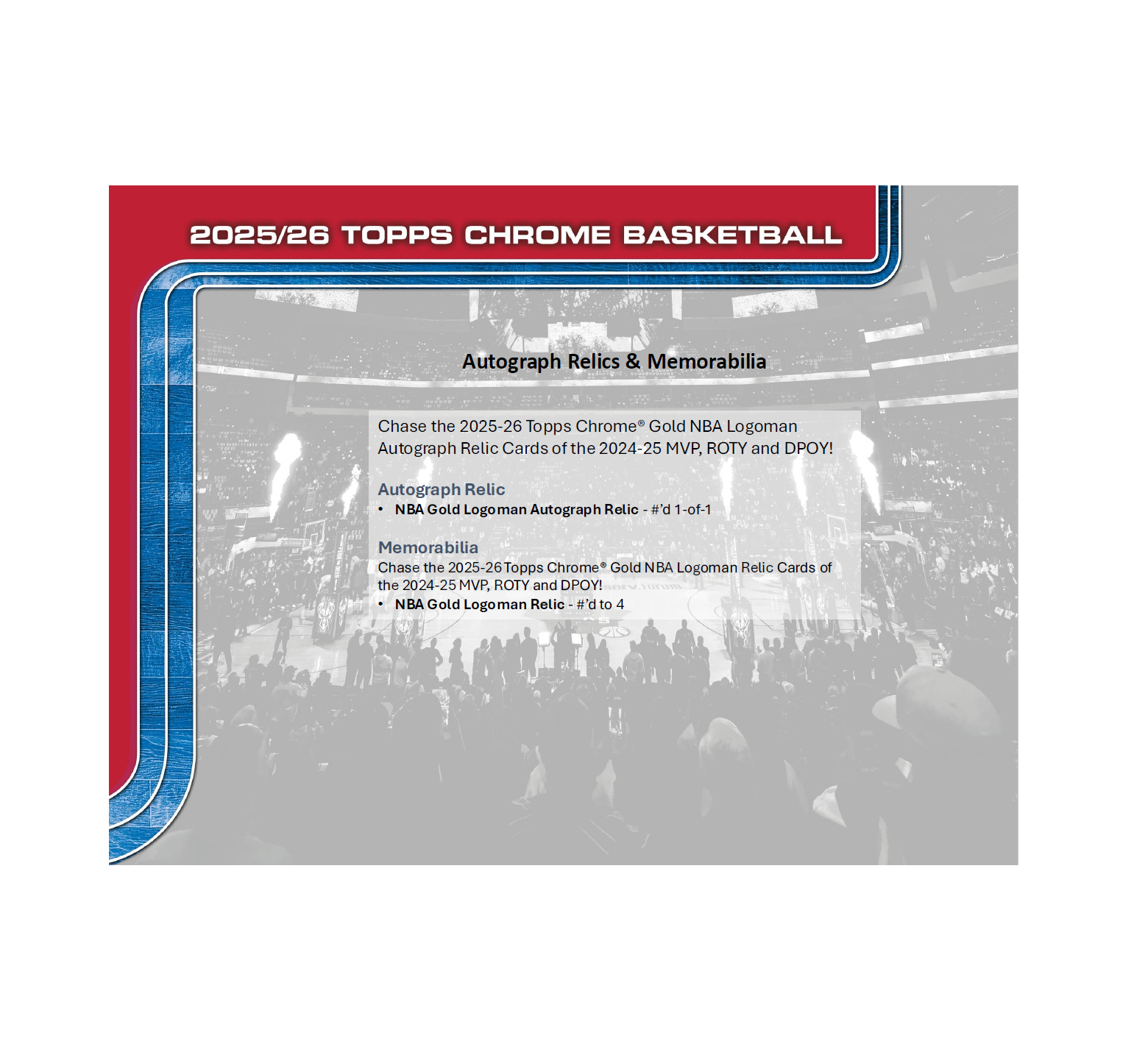 • The ultimate chase: Gold NBA Logoman Relics. Each card features a Gold NBA Logoman patch #/4 from early-season jerseys worn by the league’s three top award winners: MVP Shai Gilgeous-Alexander, Rookie of the Year Stephon Castle, and Defensive Player of the Year Evan Mobley!