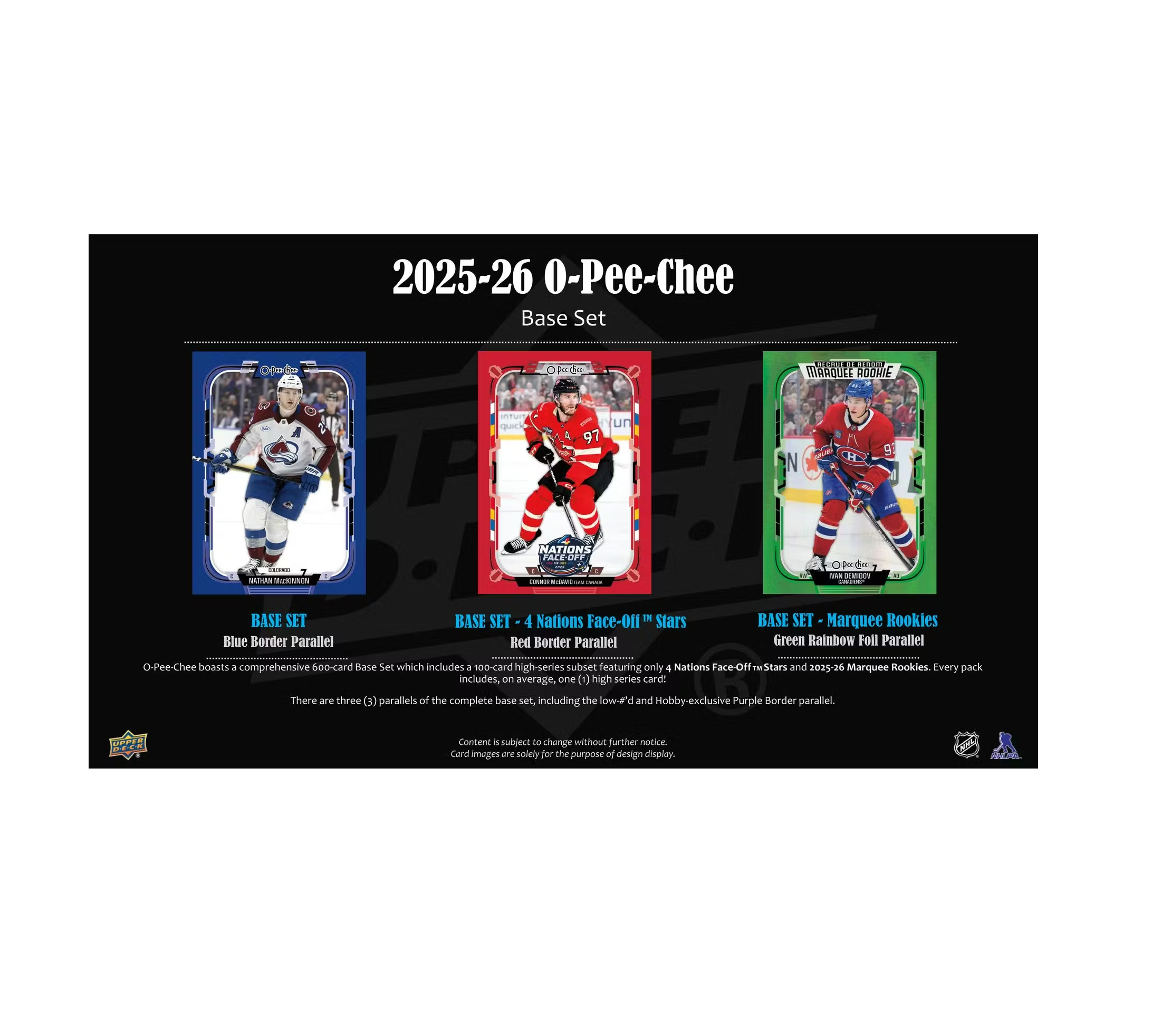 O-Pee-Chee boasts a comprehensive 600-card base set which includes a 100-card high-series subset featuring only 4 Nations Face-Off Stars and 2025-26 Marquee Rookies!
