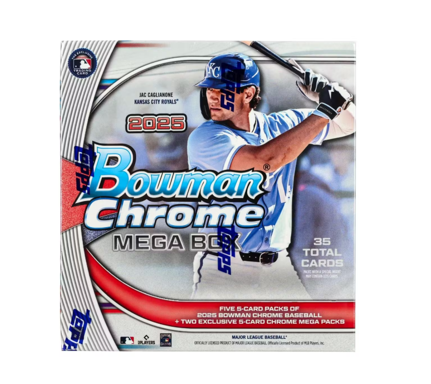 Hunt for exclusive parallels and autographs in the 2025 Bowman Chrome Baseball Mega Box! Each box includes five packs of Bowman Chrome plus two exclusive Mega Chrome packs. Look for Mojo refractors, including the 1-of-1 Rose Gold, and autographs of top prospects and rookies. Free shipping on orders over $200.