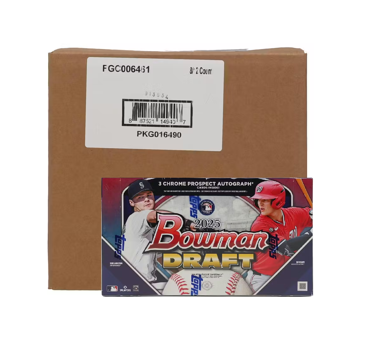 Stock up big with the 2025 Bowman Draft Baseball Jumbo Hobby 8-Box Case! 8 boxes packed with 24 total Chrome autographs of top 2025 MLB Draft prospects, massive 1st Bowman volume, Crystallized, Prized Prospects, Axis inserts, and Dream Draft Picks. Ultimate case for breakers!