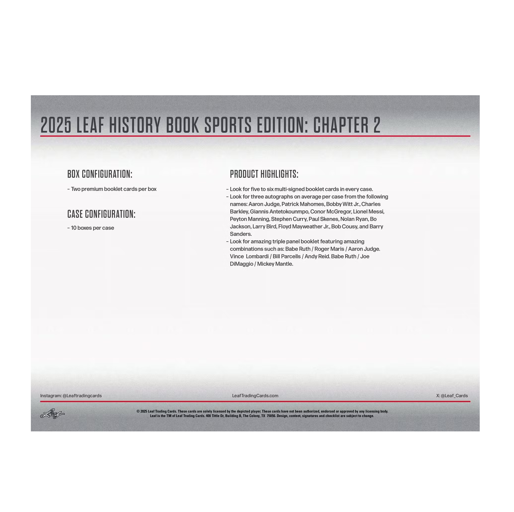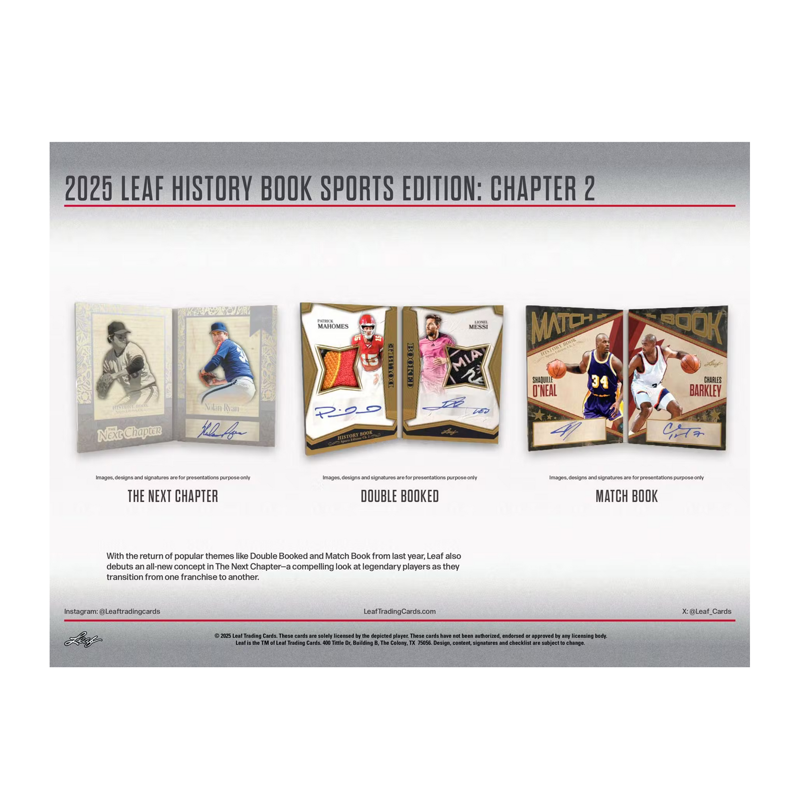 2025 Leaf History Book Sports Edition Chapter 2 boxes feature two premium booklet cards per box. Look for iconic legends and rising stars, with new signers including Patrick Mahomes, Aaron Judge, and Bobby Witt Jr. Each card is a tribute to sports history with game-used relics and autographs.