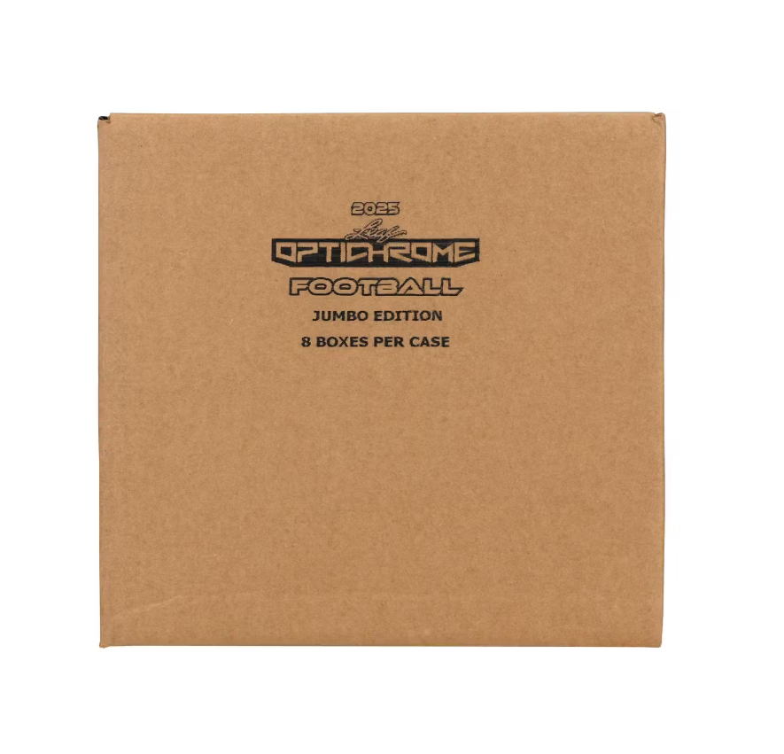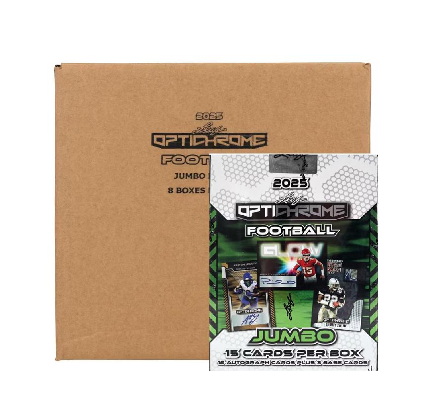 A 2025 Leaf Optichrome Football Jumbo 8-Box Case delivers 12 on-card autographs per box, for a total of 96 autos per case. All cards are serial numbered, and all base cards are 1/1s! Look for rare multi-signed cards, metal memorabilia cards, and Jumbo-exclusive basketball previews. Free shipping on orders over $200.
