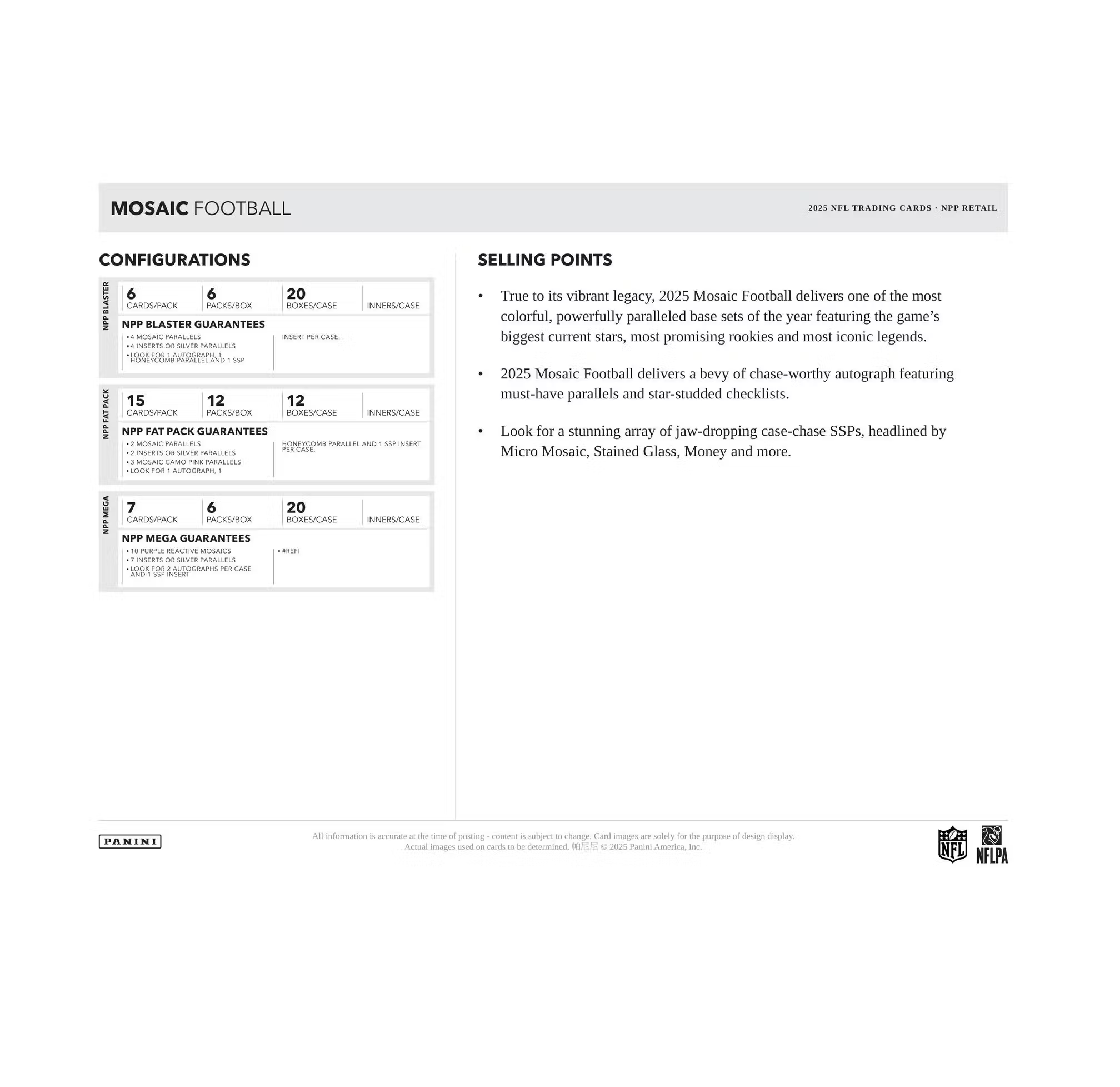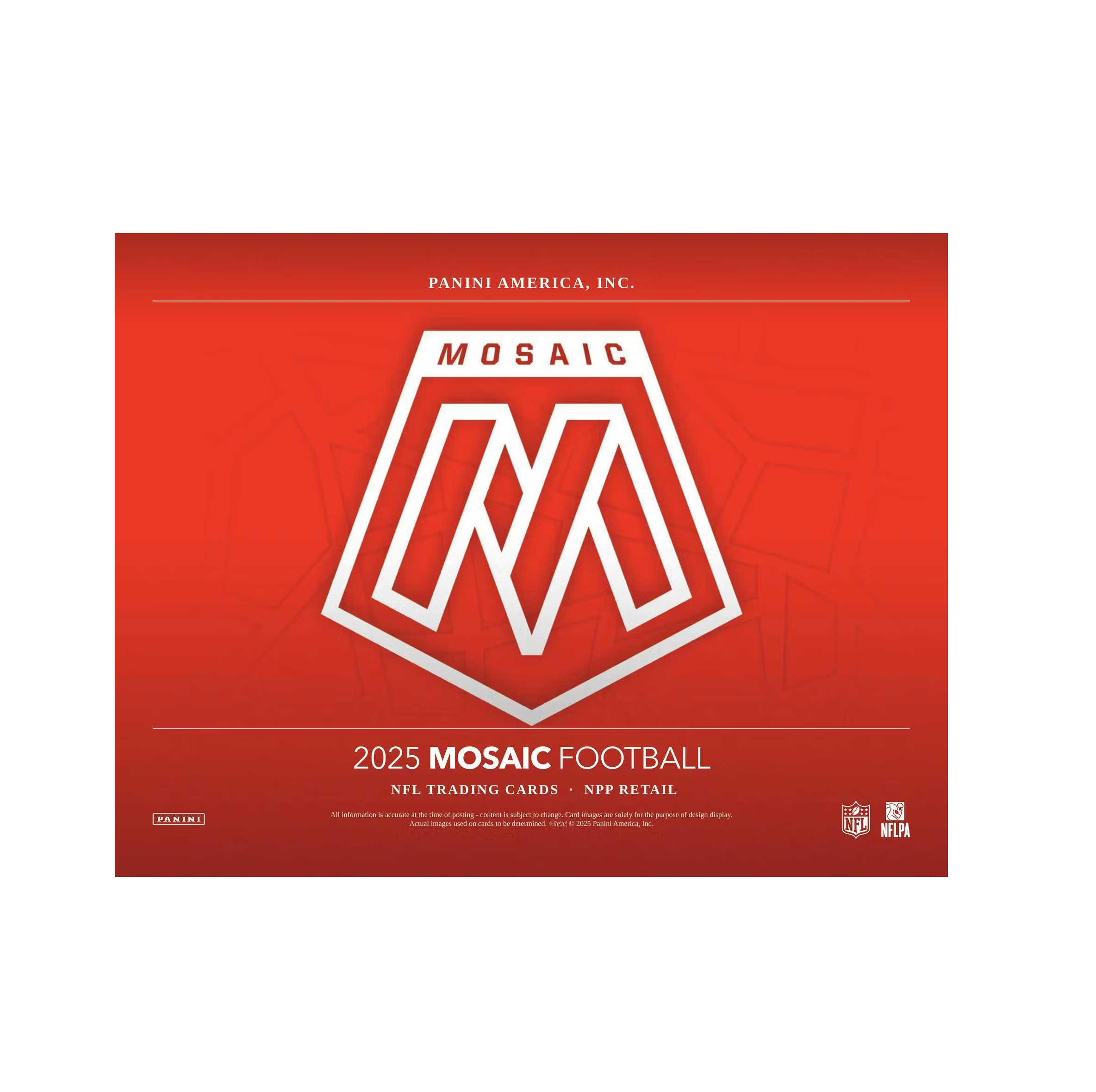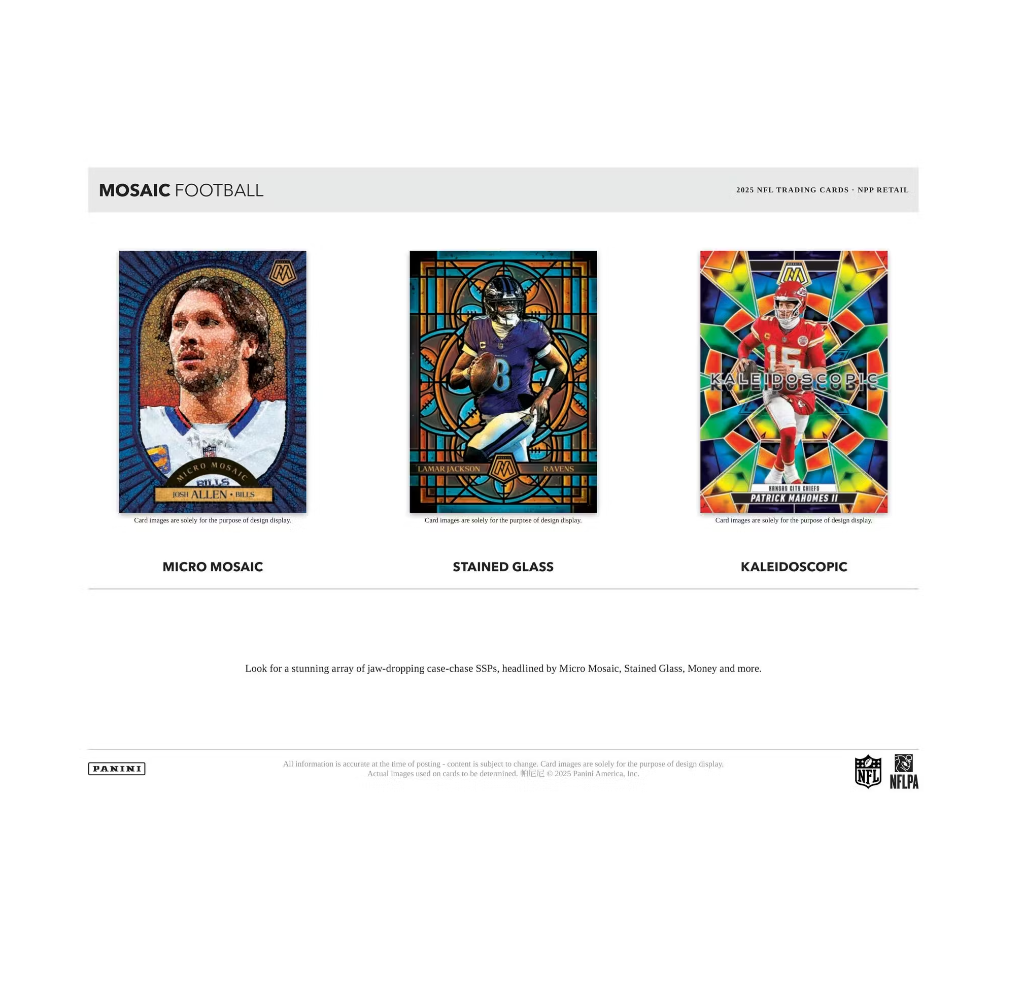 True to its vibrant legacy, 2025 Mosaic Football delivers one of the most colorful, powerfully paralleled base sets of the year featuring the game's biggest current stars, most promising rookies and most iconic legends.