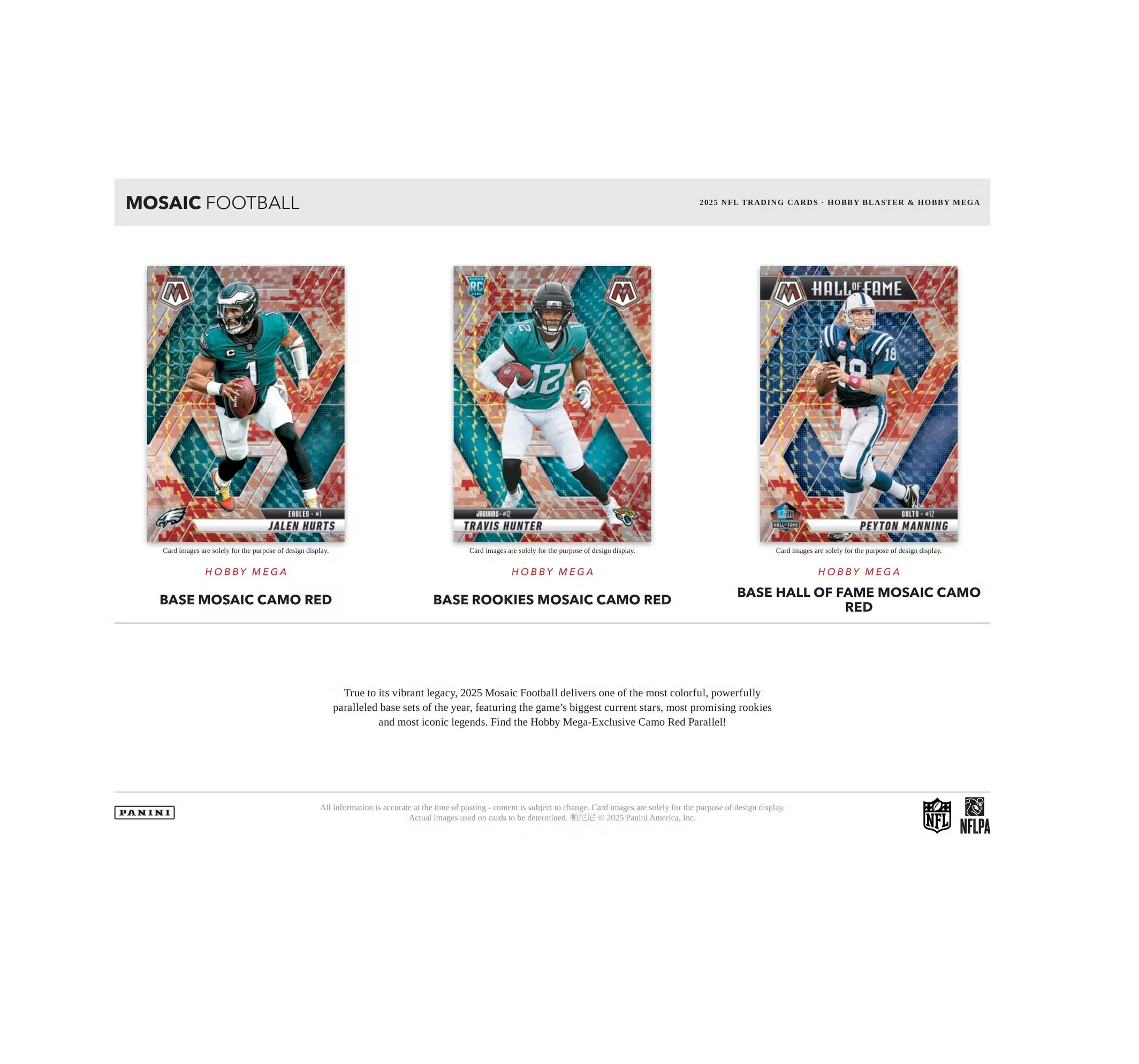 True to its vibrant legacy, 2024 Mosaic Football delivers one of the most colorful, powerfully paralleled base sets of the year featuring the game’s biggest current stars, promising rookies, and most iconic legends.