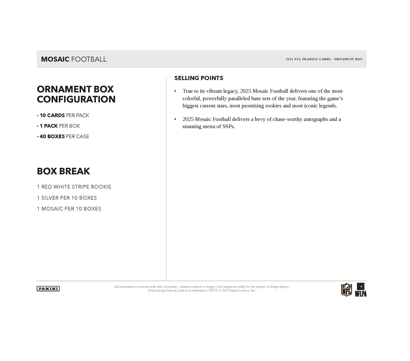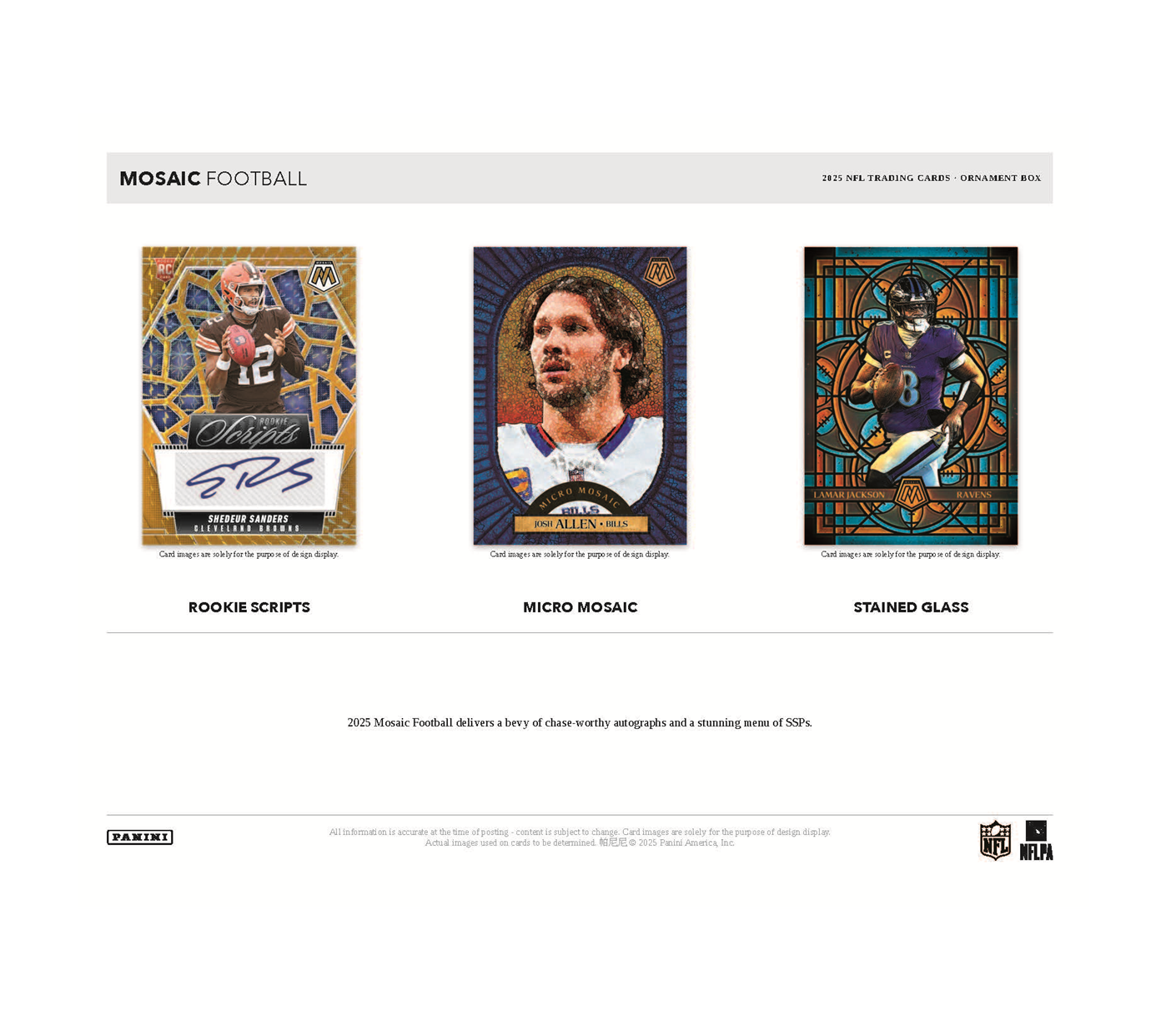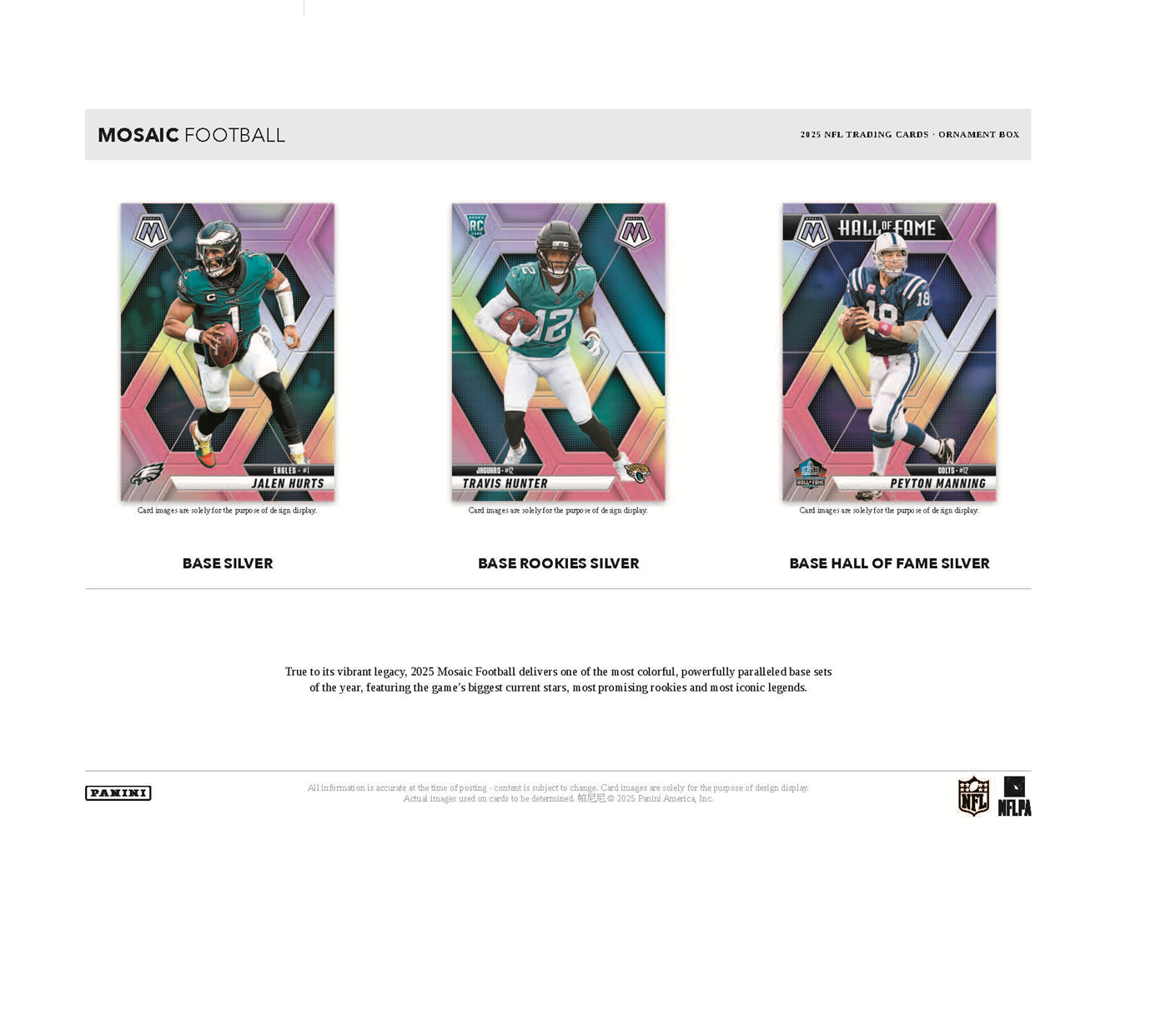True to its vibrant legacy, 2025 Mosaic Football delivers one of the most colorful, powerfully paralleled base sets of the year, featuring the game’s biggest current stars, most promising rookies and most iconic legends.