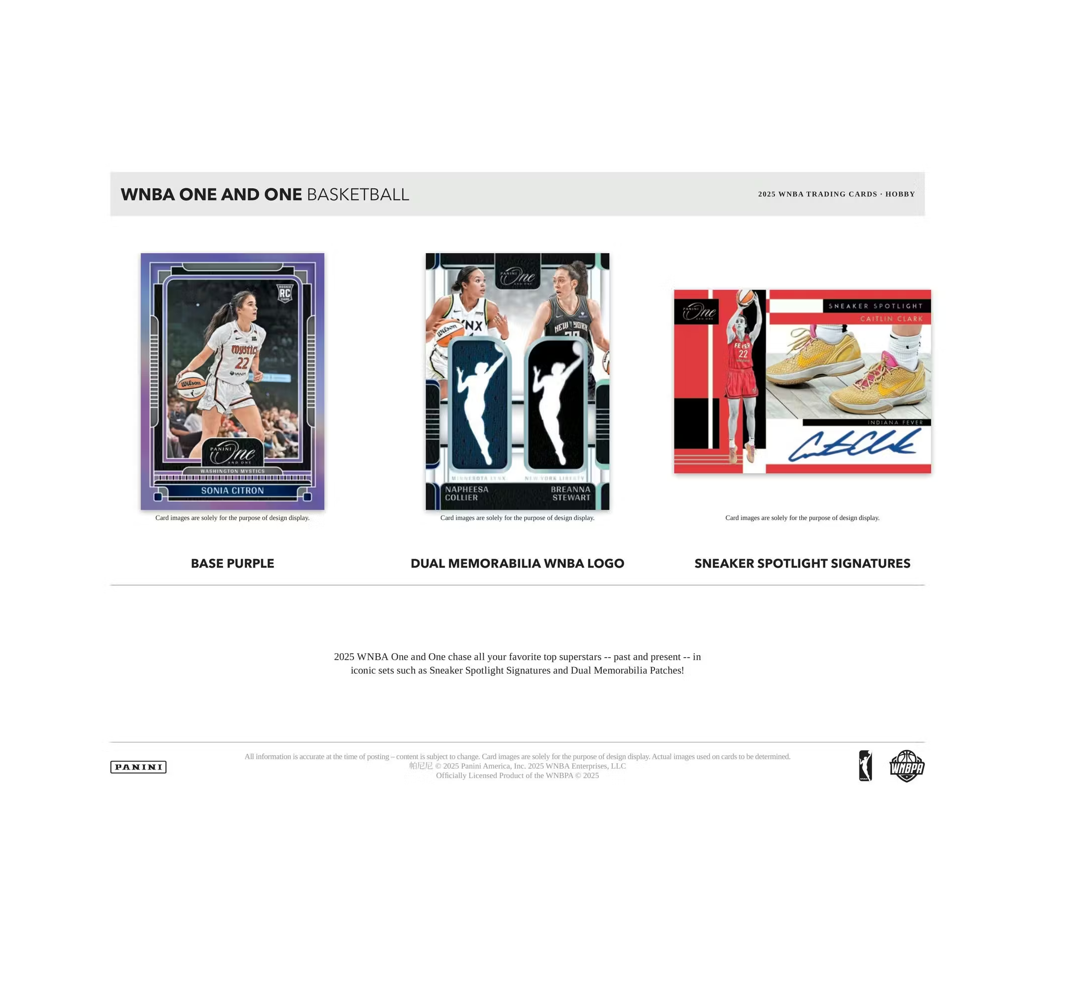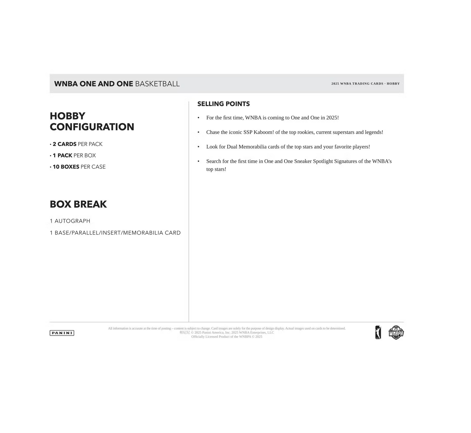 Discover the debut premium thrill of the 2025 Panini One & One WNBA Hobby Box! Just 2 encased cards per box deliver 1 on-card autograph plus 1 base, parallel, insert, or relic—hunt explosive SSP Kaboom, rare Logowoman patches, Dual Memorabilia, Sneaker Spotlight signatures, and gems from WNBA rookies, stars.