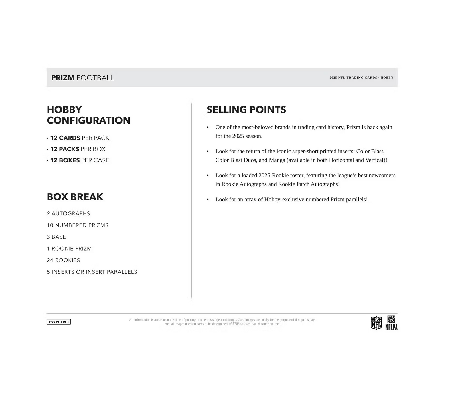 •  Look for a loaded 2025 Rookie roster, featuring the league’s best newcomers in Rookie Autographs and Rookie Patch Autographs! - Look for an array of Hobby-exclusive numbered Prizm parallels!