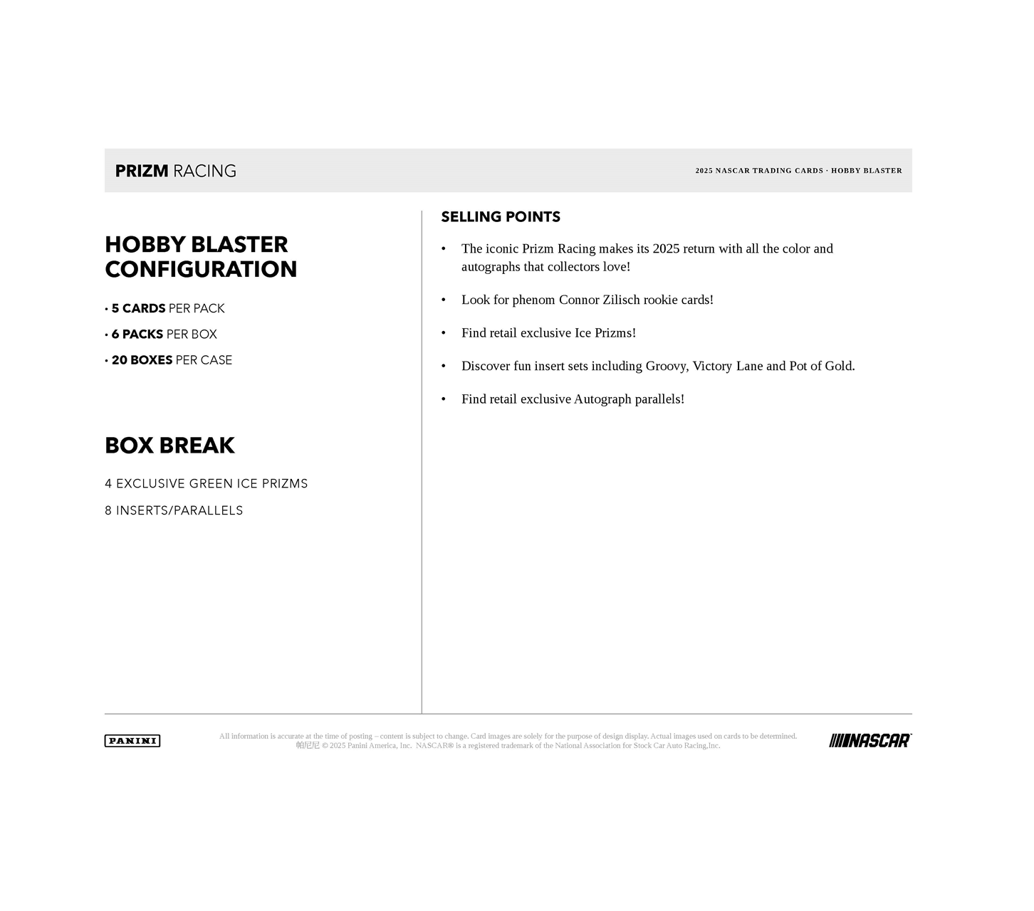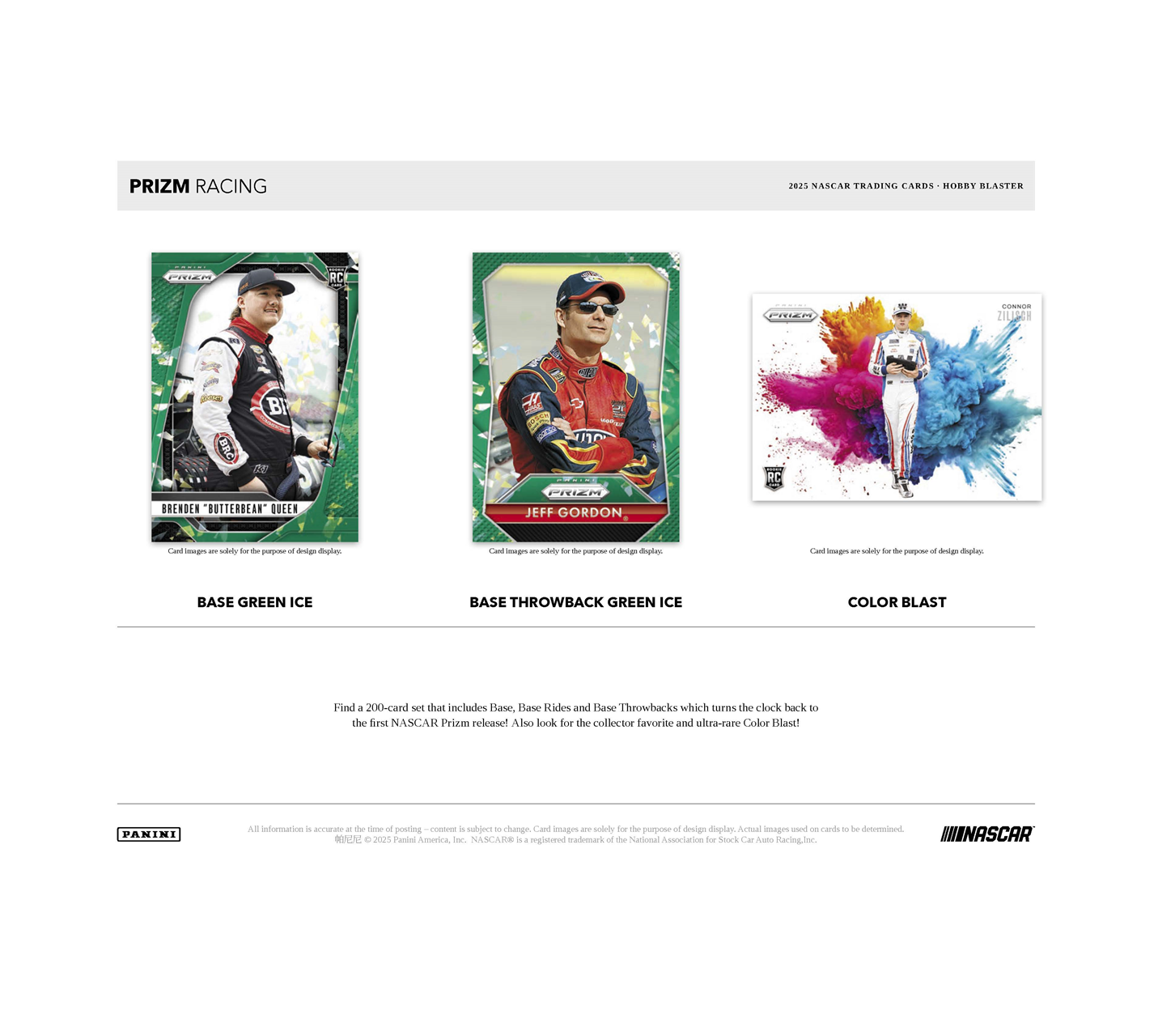 Discover the 2025 Panini Prizm Racing Hobby Blaster 20-Box Case: 20 boxes with 6 packs each (5 cards/pack), featuring blaster-exclusive Green Ice Prizms (4/box avg), extra inserts/parallels, possible autographs, and chrome hits from NASCAR stars, legends, and rising rookies like Connor Zilisch.