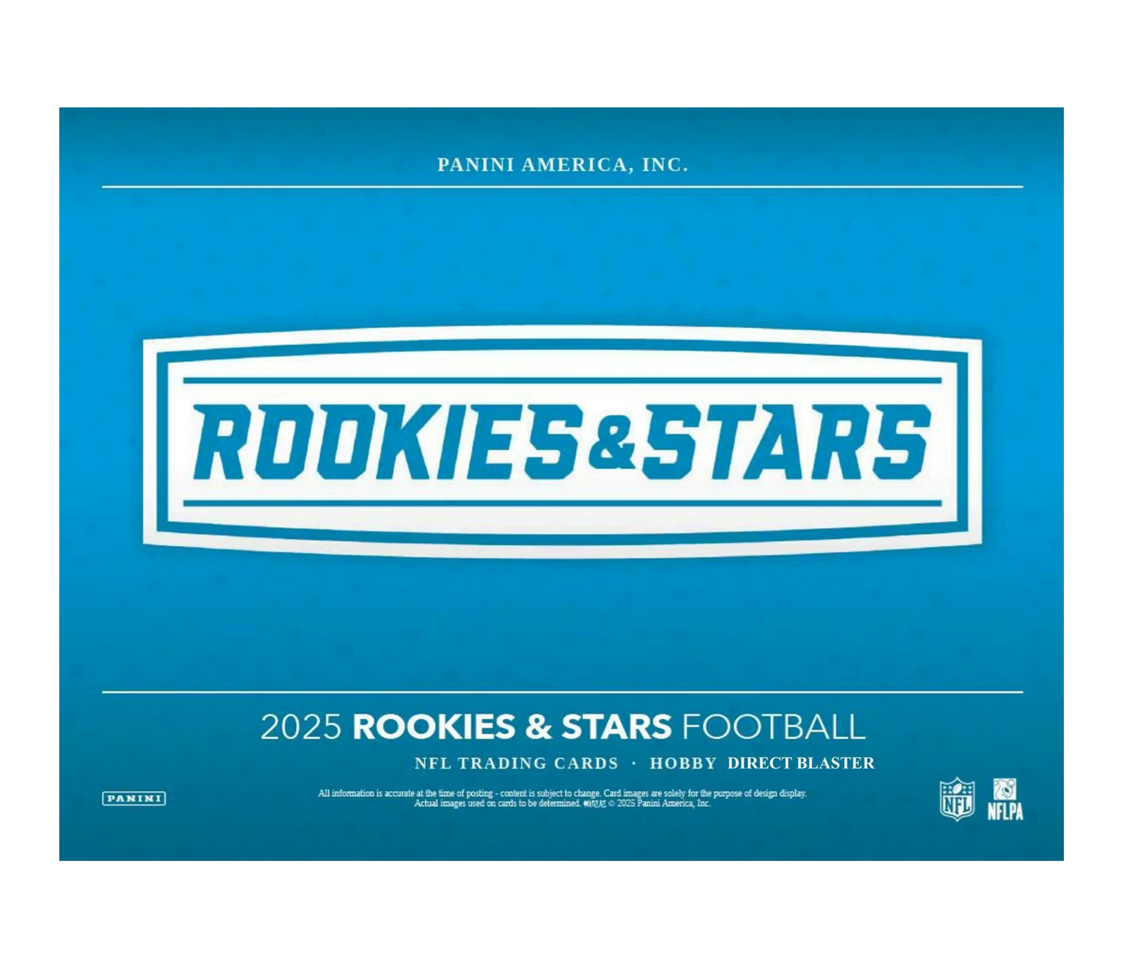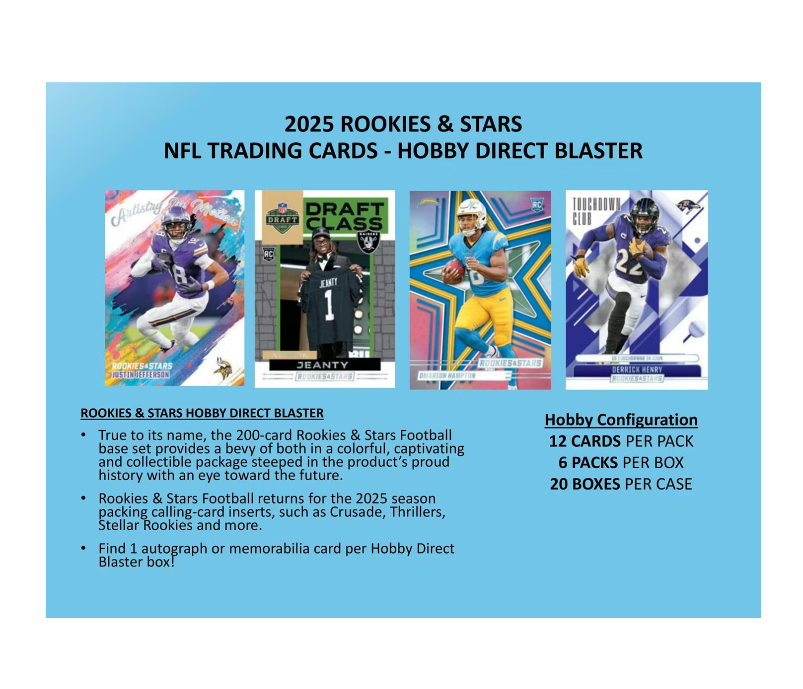 The 2025 Panini Rookies & Stars Football Hobby Direct Blaster Box delivers a 200-card base set featuring a rich blend of rookies and established NFL stars presented in bold, colorful card designs. The product continues the brand’s legacy with a collectible assortment of inserts such as Crusade, Thrillers, Stellar Rookies, and additional calling-card subsets that highlight top performers and emerging talent across the league. Rookies & Stars returns for the 2025 season with its signature mix of historical homage and forward-looking star power, offering collectors a strong balance of base content, parallels, and premium chase cards. Each Hobby Direct Blaster averages one autograph or memorabilia card, enhancing the hit potential in every box.