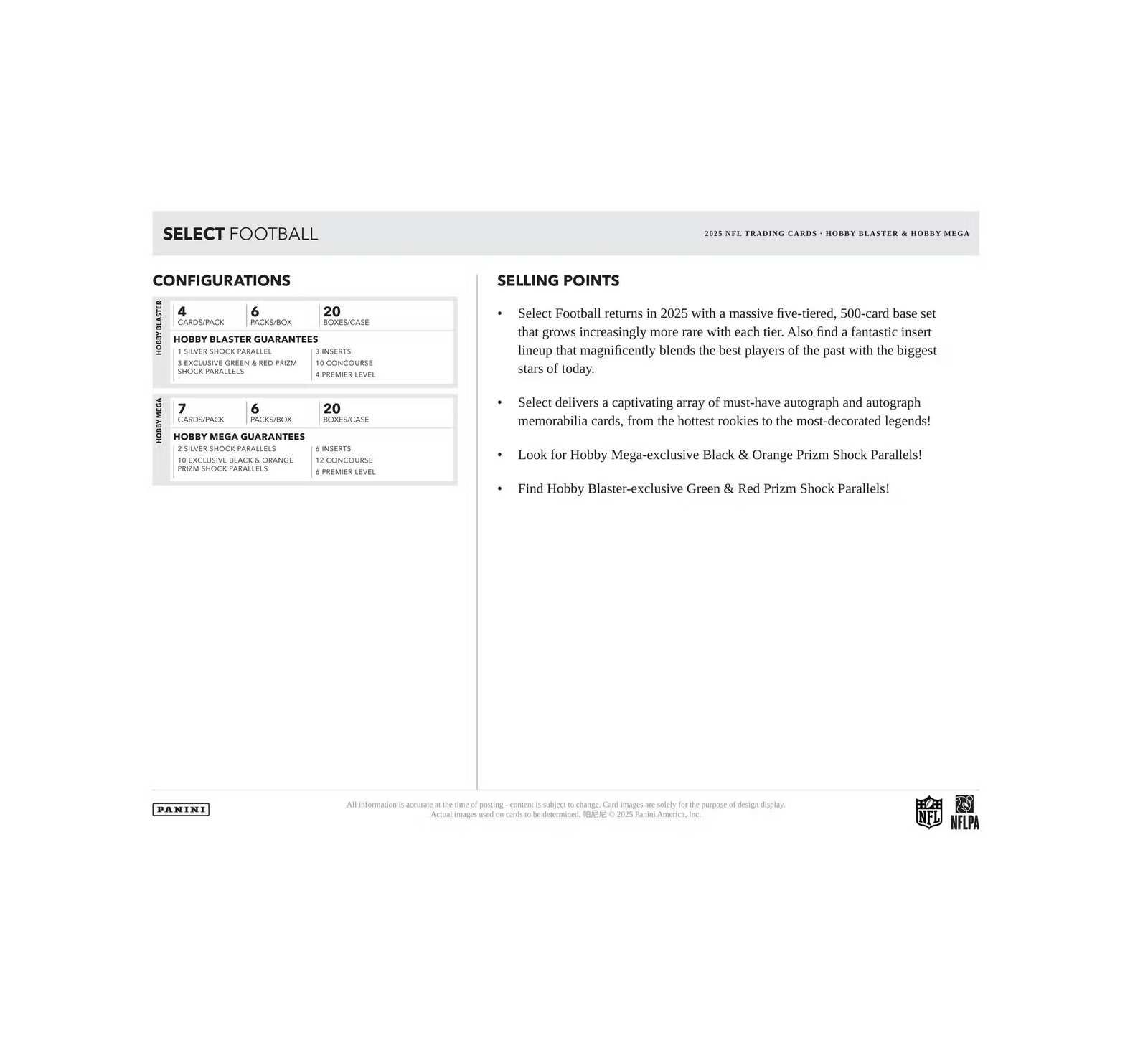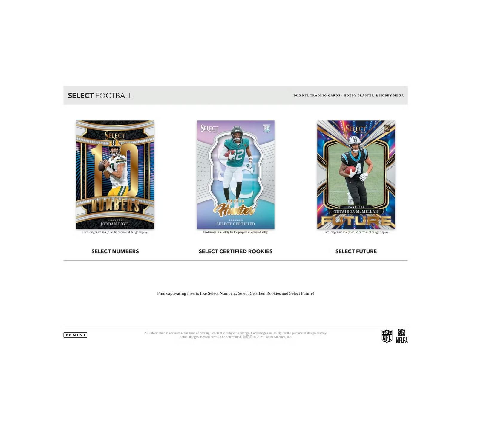Select Football returns in 2025 with a massive five-tiered, 500-card base set that grows increasingly more rare with each tier. Also find a fantastic insert lineup that magnificently blends the best players of the past with the biggest stars of today.