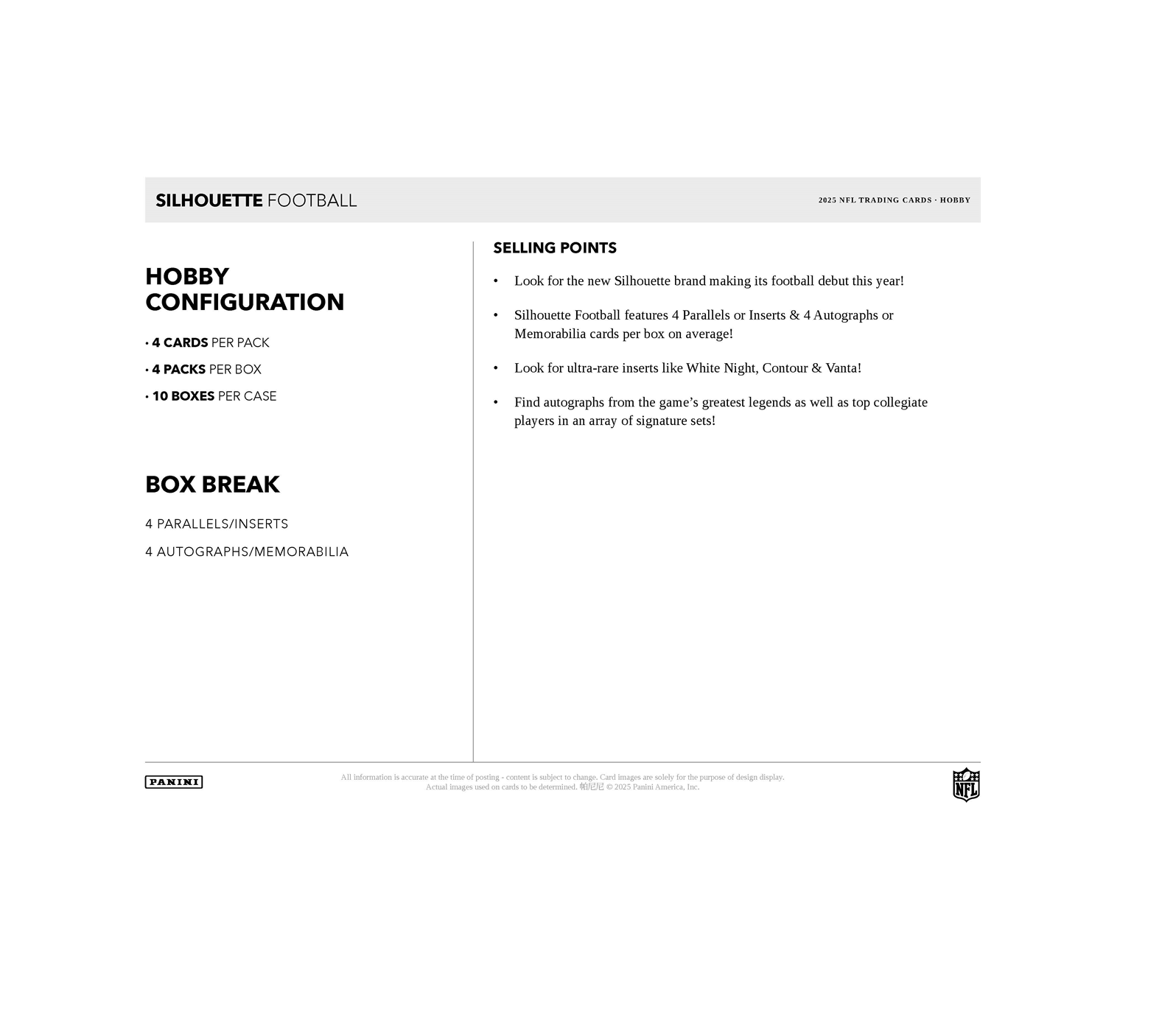Score the historic debut of the 2025 Panini Silhouette Football Hobby Box! Each box delivers 4 autographs or memorabilia cards and 4 parallels or inserts. Chase ultra-rare White Night and Vanta SSPs featuring the league's top stars. Add this premium launch to your collection at The Awesome Card Shop today!