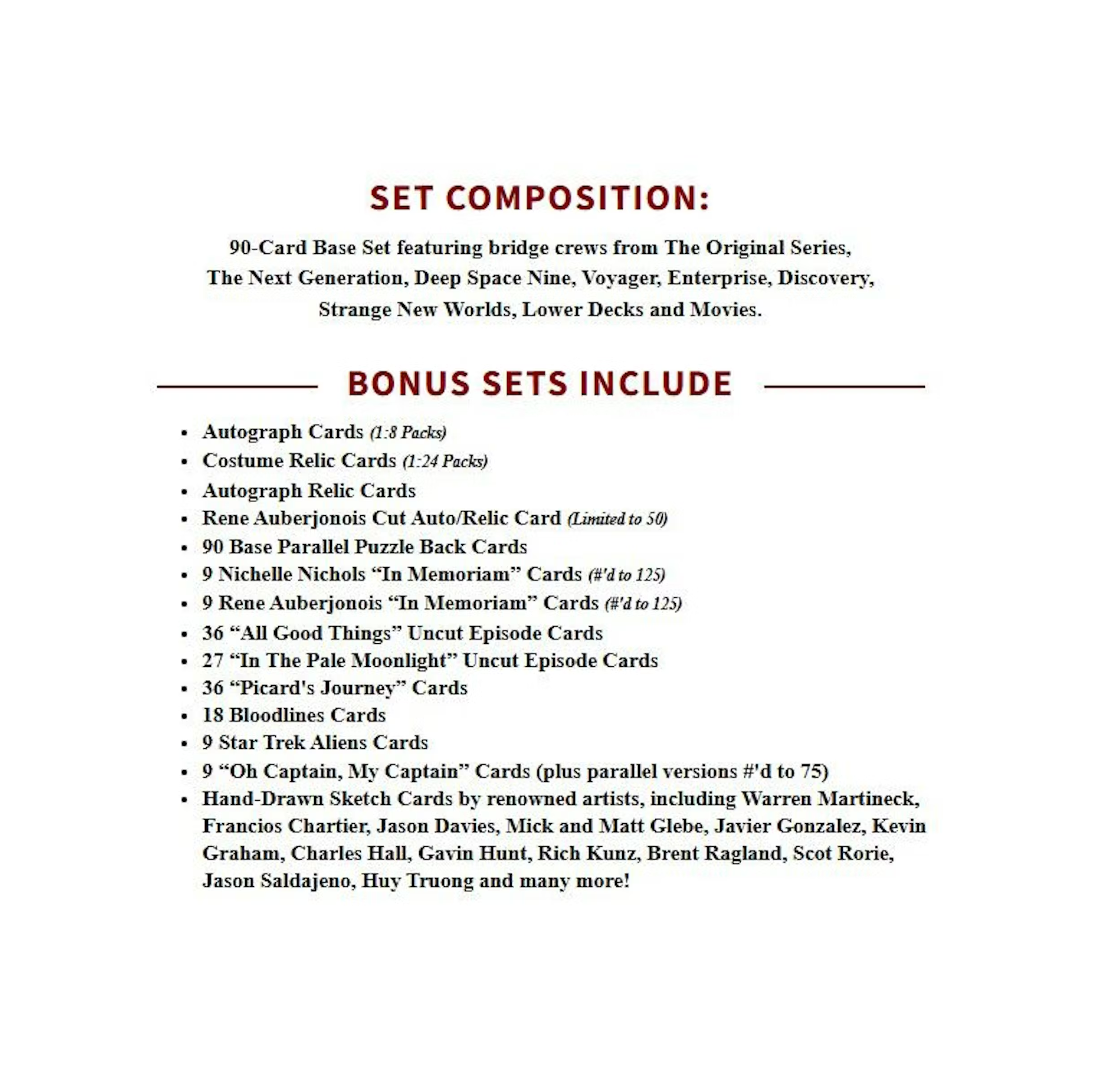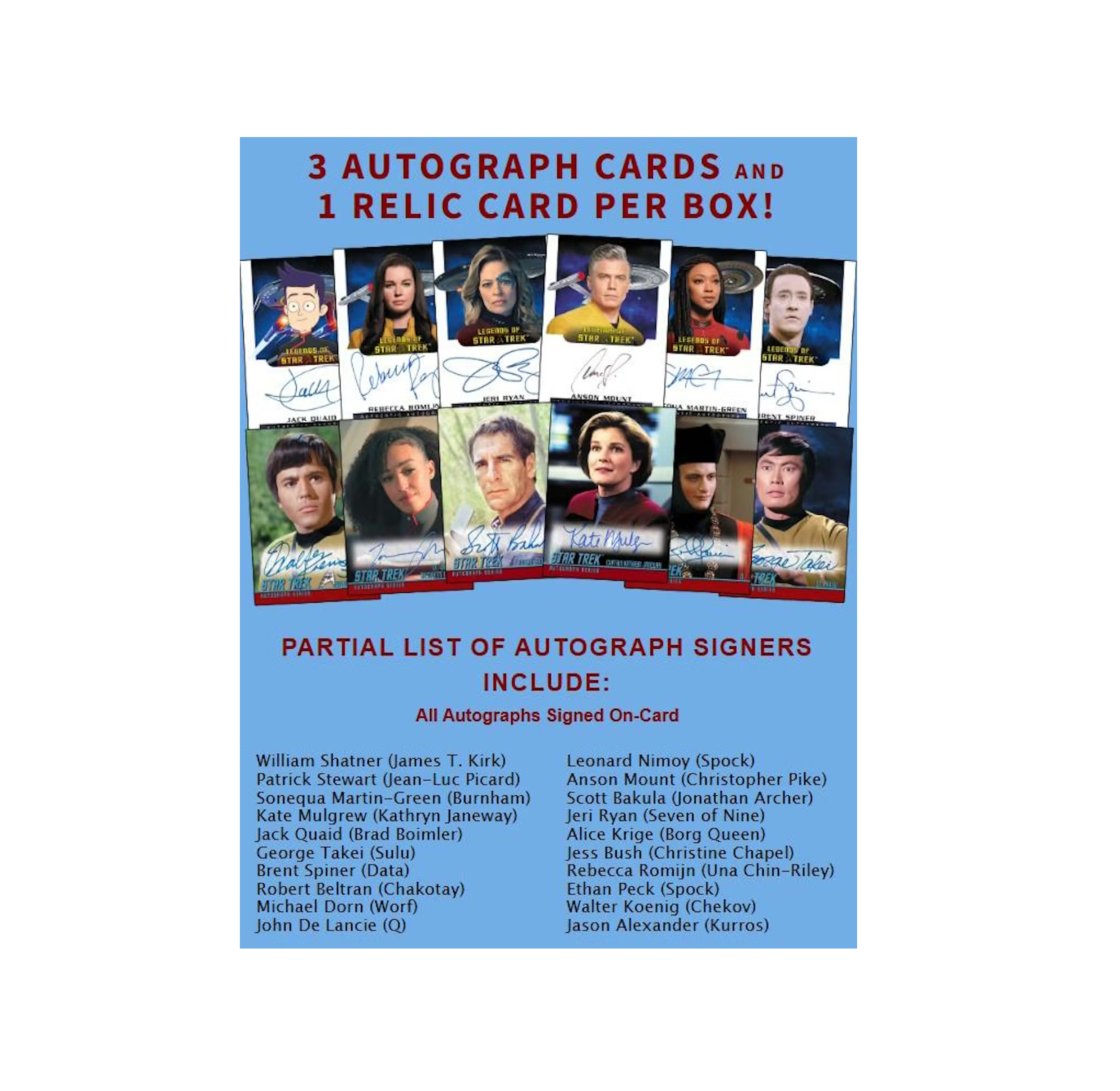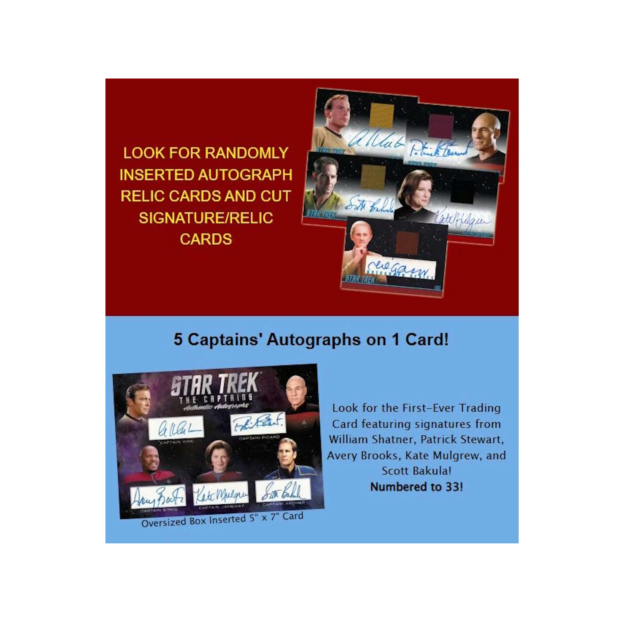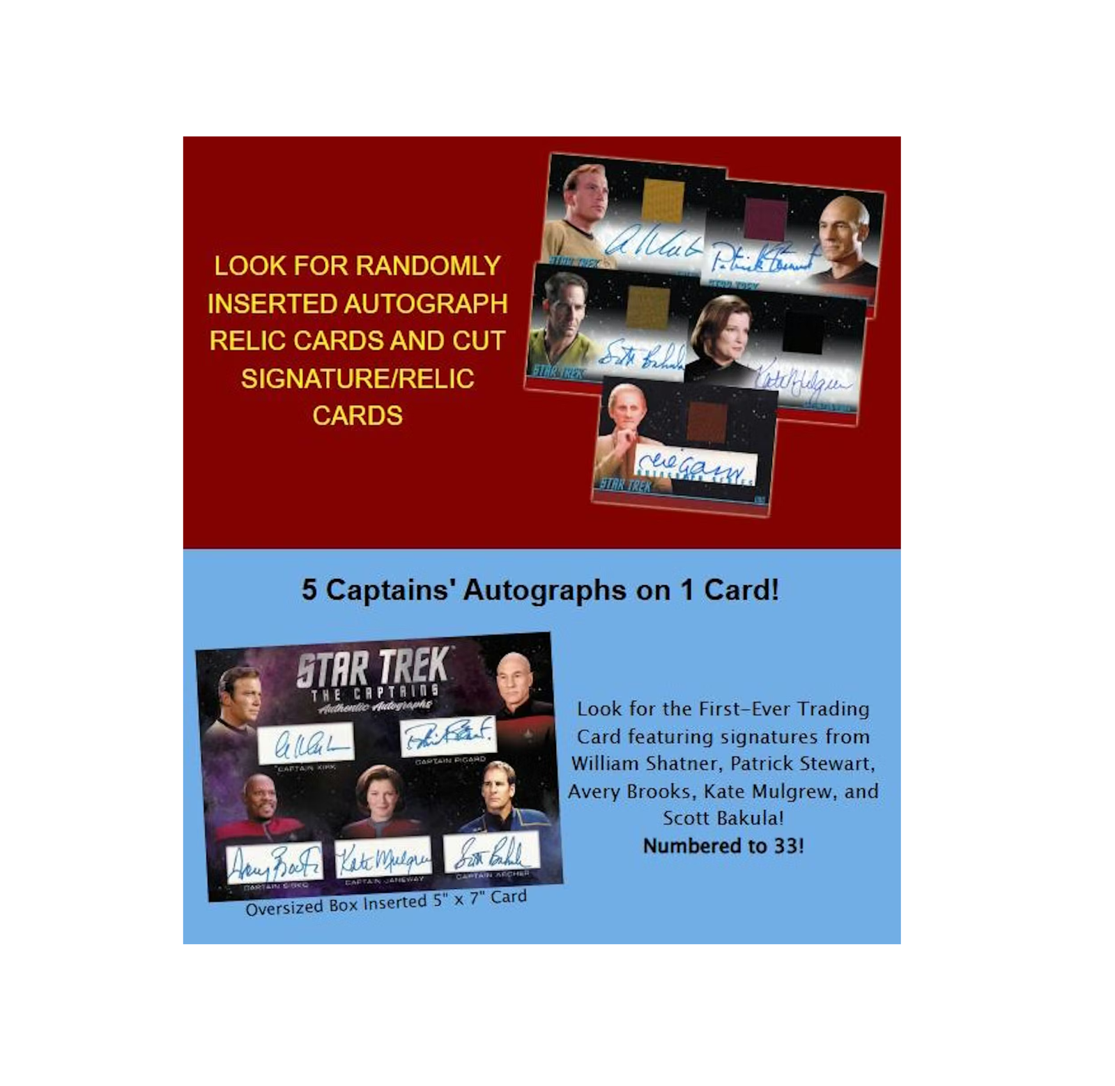 Look for the First-Ever Trading Card featuring signatures from William Shatner, Patrick Stewart, Kate Mulgrew, Avery Brooks and Scott Bakula! Numbered to 33!