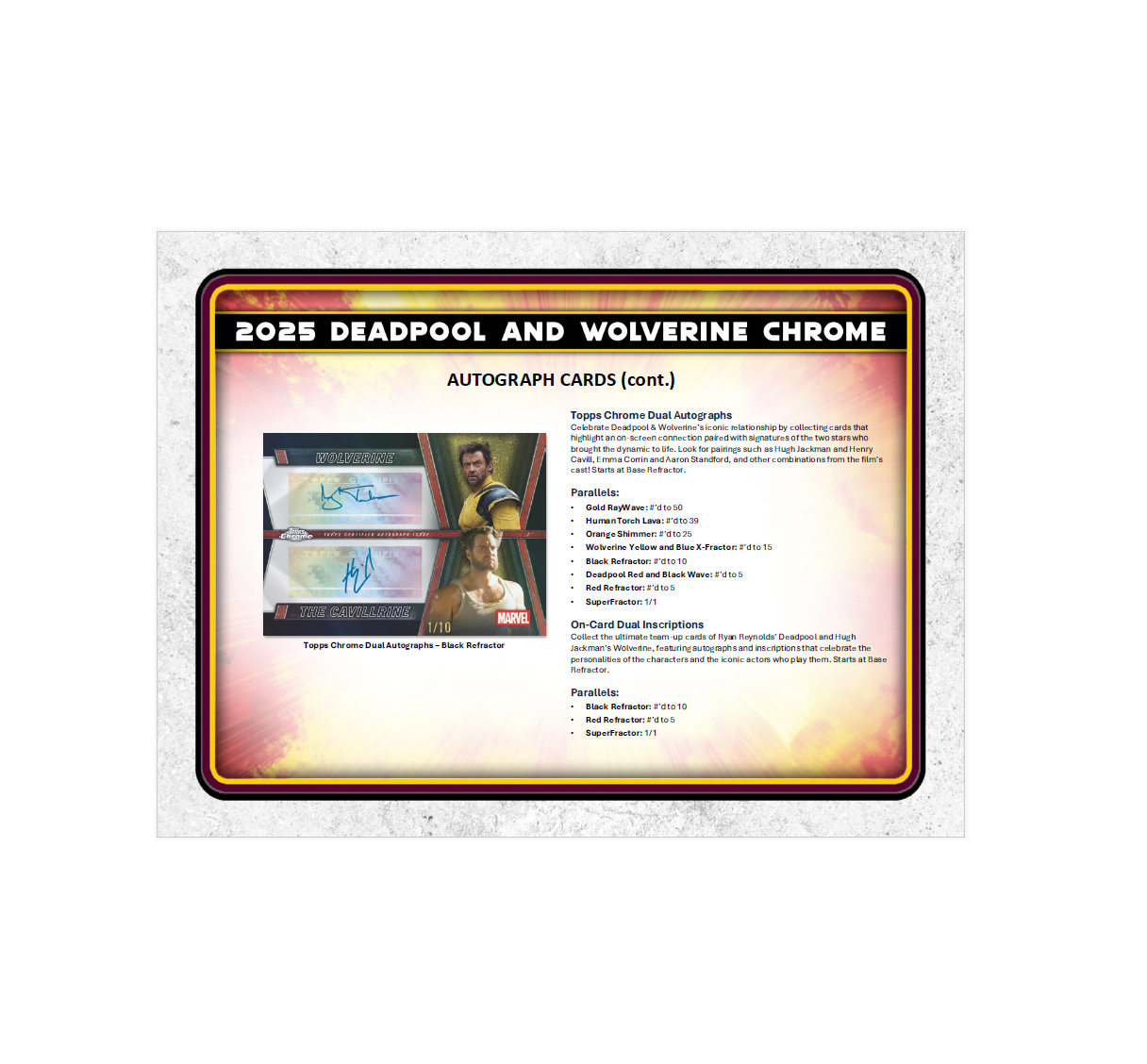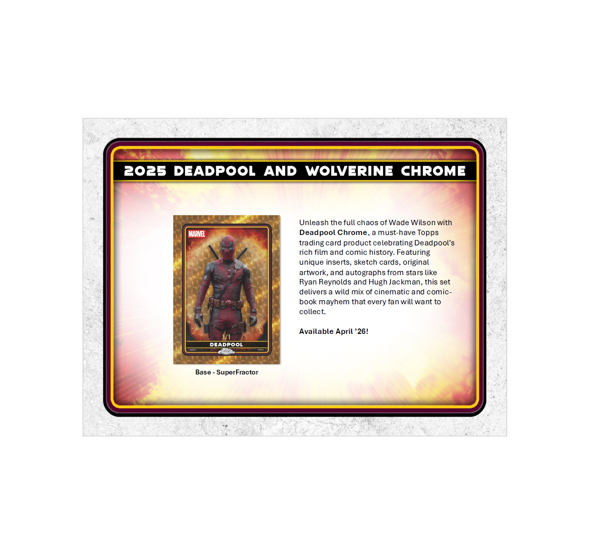 •  Unleash the full chaos of Wade Wilson with 2025 Topps Deadpool Chrome®, a must-have trading card release celebrating Deadpool’s rich comic and cinematic history. Featuring a dynamic 100-card Base Set, dazzling Chrome® parallels, rare case hits, sketch cards, original artwork, and autographs from stars like Ryan Reynolds and Hugh Jackman, this product delivers a wild mix of comic book mayhem and big-screen action. Chase autographs of Ryan Reynolds, Hugh Jackman, Emma Corrin, Ryan Brown, and others.