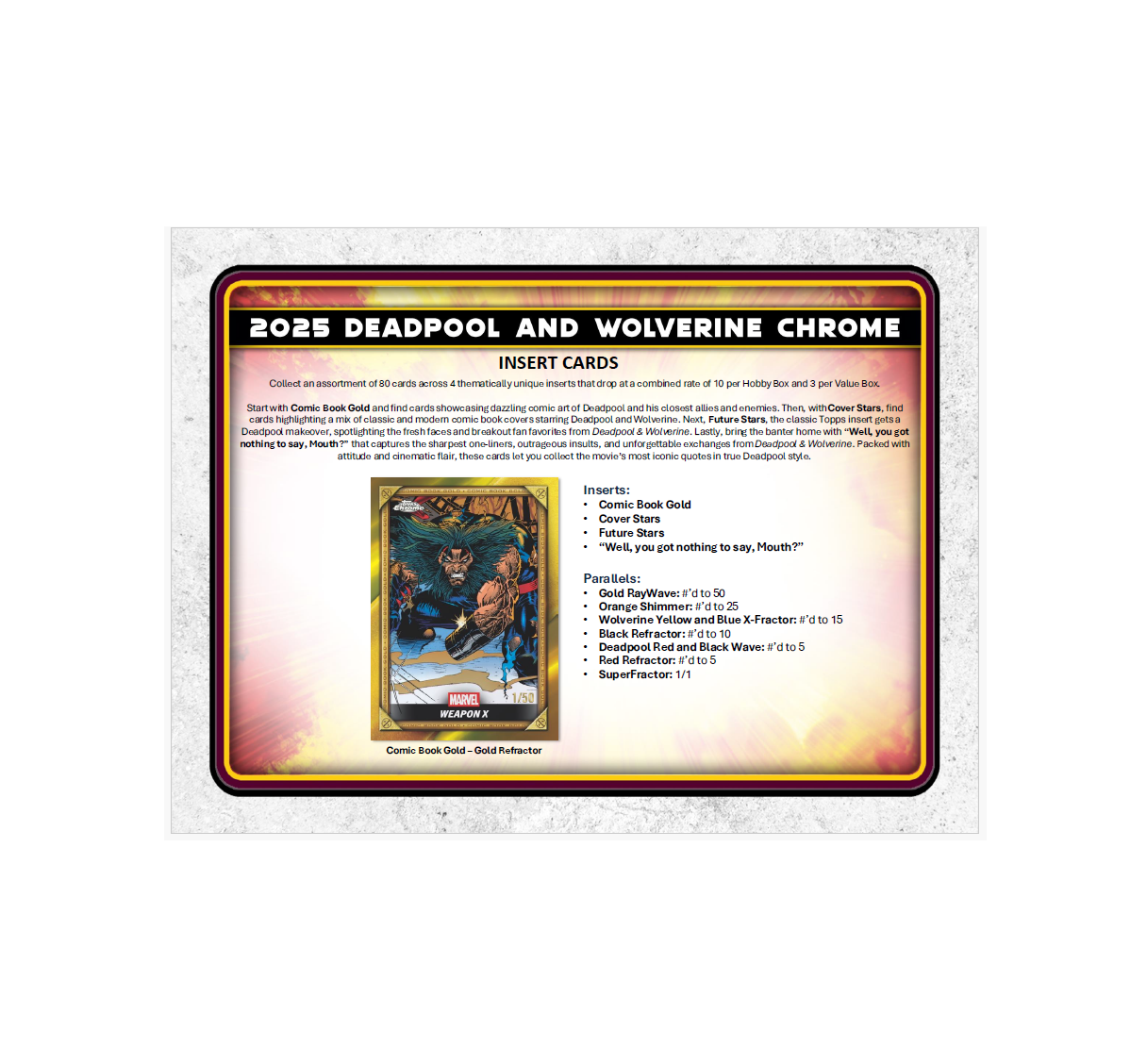• Celebrate the legacy of Deadpool with inserts and parallels that spotlight his comic book roots, including Comic Book Gold, Cover Stars, and original art inserts like Reflections and Topps Originals. Explore his cinematic evolution with film-inspired sets like Best Bubs and the The Void Shadowbox. From iconic comic book art to unforgettable moments from Deadpool & Wolverine, this set is as unpredictable, hilarious, and collectible as the Merc with a Mouth himself.