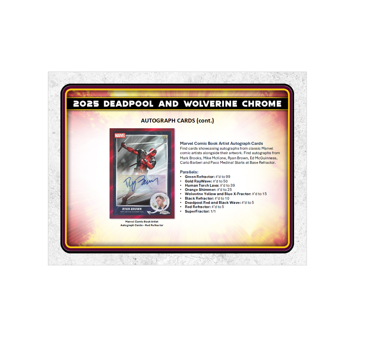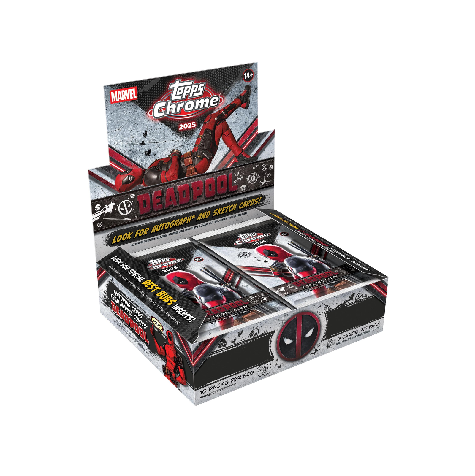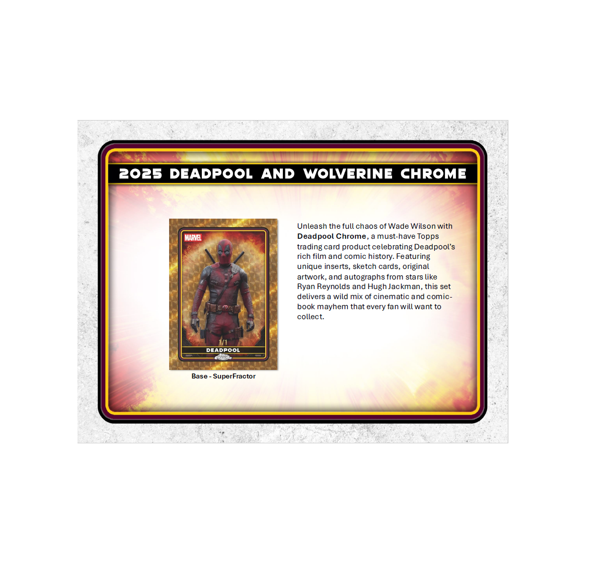 •  Unleash the full chaos of Wade Wilson with 2025 Topps Deadpool Chrome®, a must-have trading card release celebrating Deadpool’s rich comic and cinematic history. Featuring a dynamic 100-card Base Set, dazzling Chrome® parallels, rare case hits, sketch cards, original artwork, and autographs from stars like Ryan Reynolds and Hugh Jackman, this product delivers a wild mix of comic book mayhem and big-screen action. Chase autographs of Ryan Reynolds, Hugh Jackman, Emma Corrin, Ryan Brown, and others.