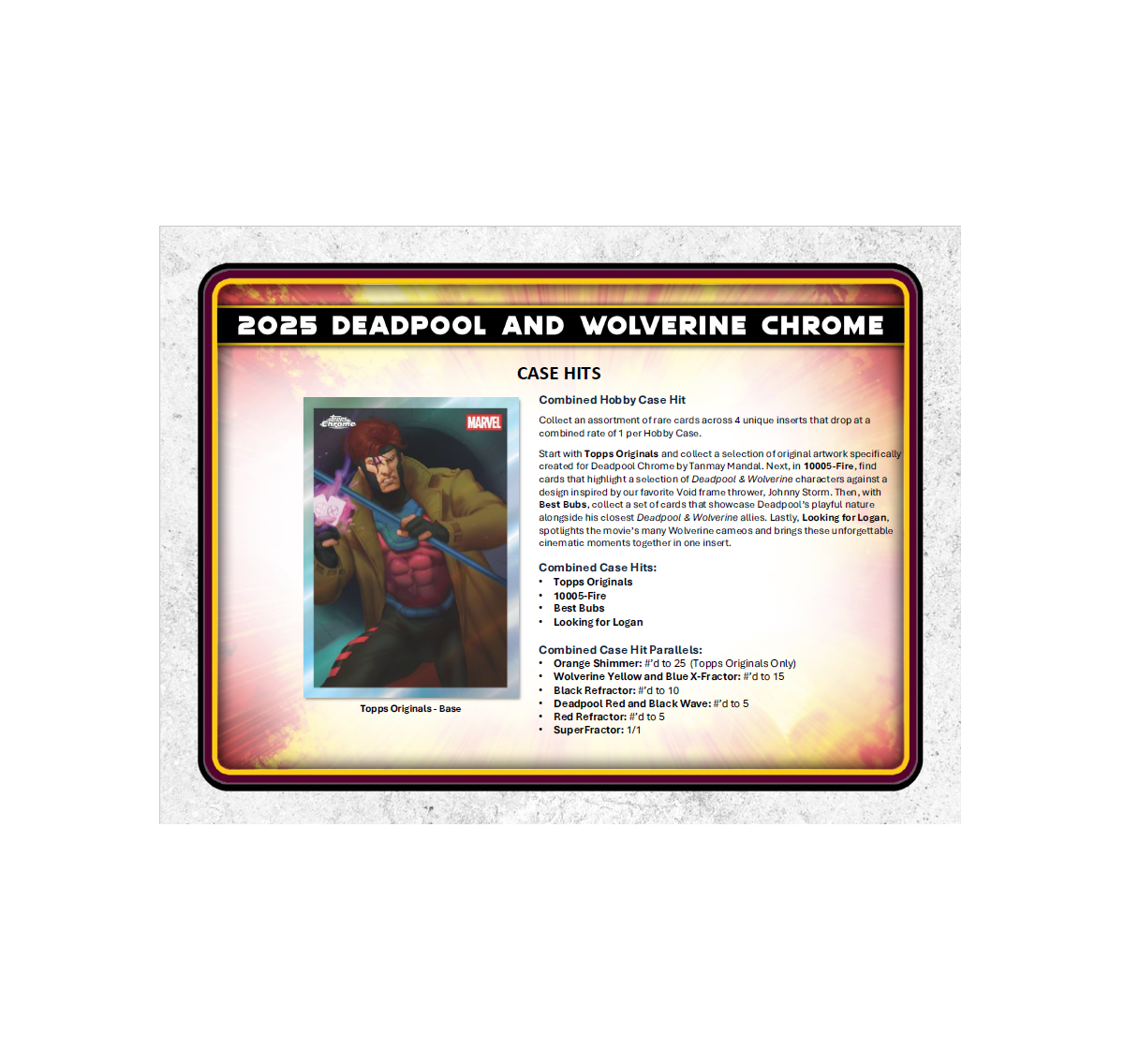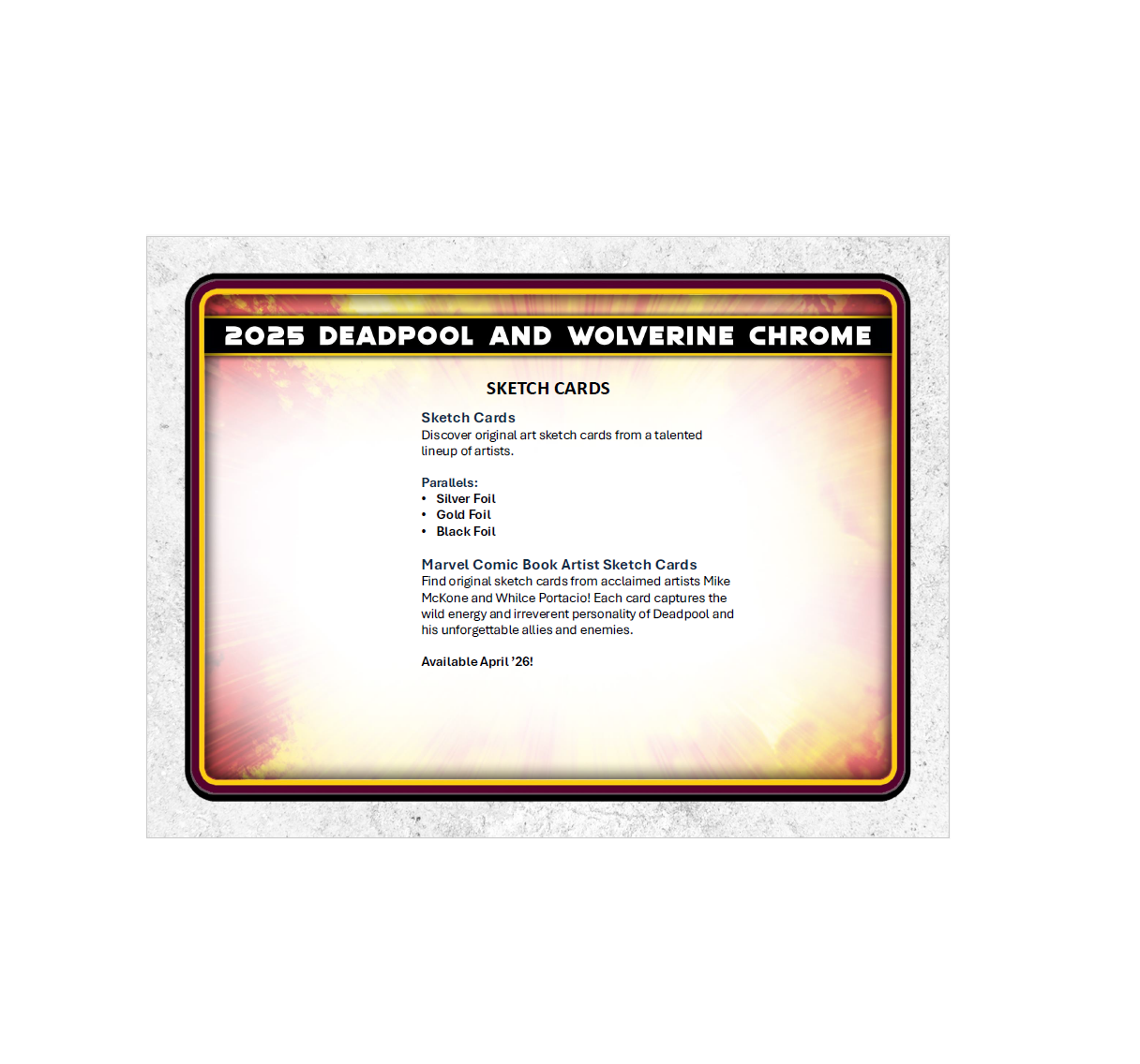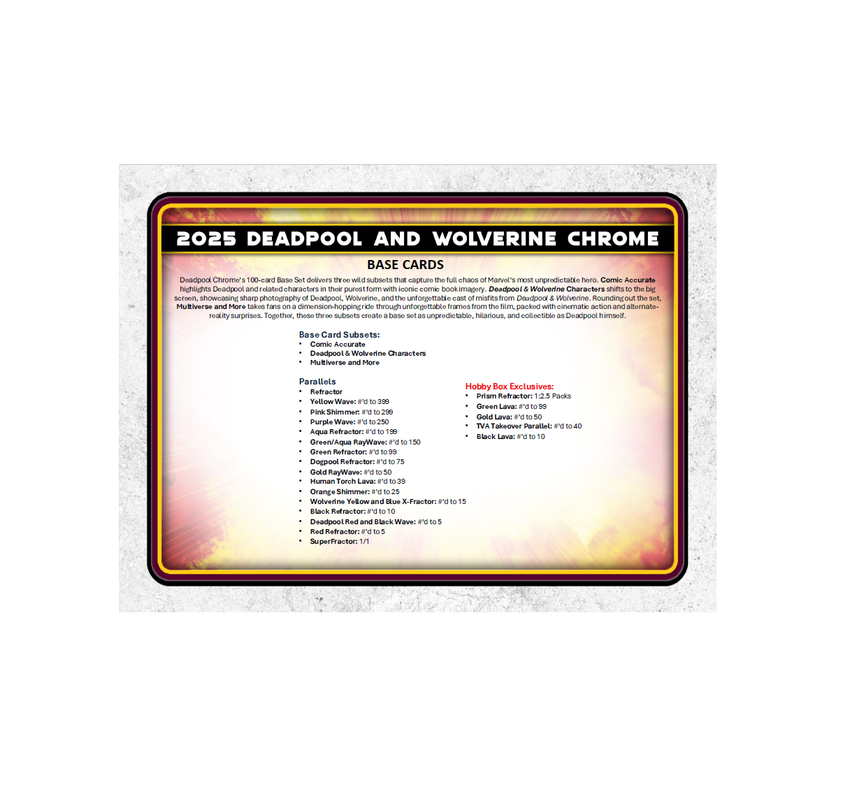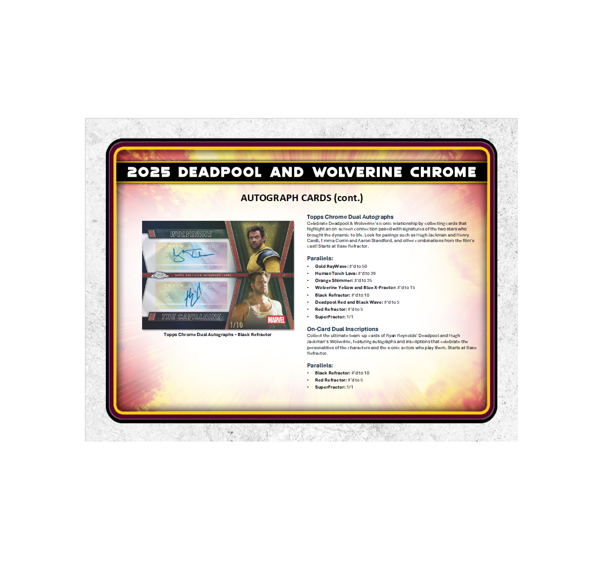 •  Unleash the full chaos of Wade Wilson with 2025 Topps Deadpool Chrome®, a must-have trading card release celebrating Deadpool’s rich comic and cinematic history. Featuring a dynamic 100-card Base Set, dazzling Chrome® parallels, rare case hits, sketch cards, original artwork, and autographs from stars like Ryan Reynolds and Hugh Jackman, this product delivers a wild mix of comic book mayhem and big-screen action. Chase autographs of Ryan Reynolds, Hugh Jackman, Emma Corrin, Ryan Brown, and others.