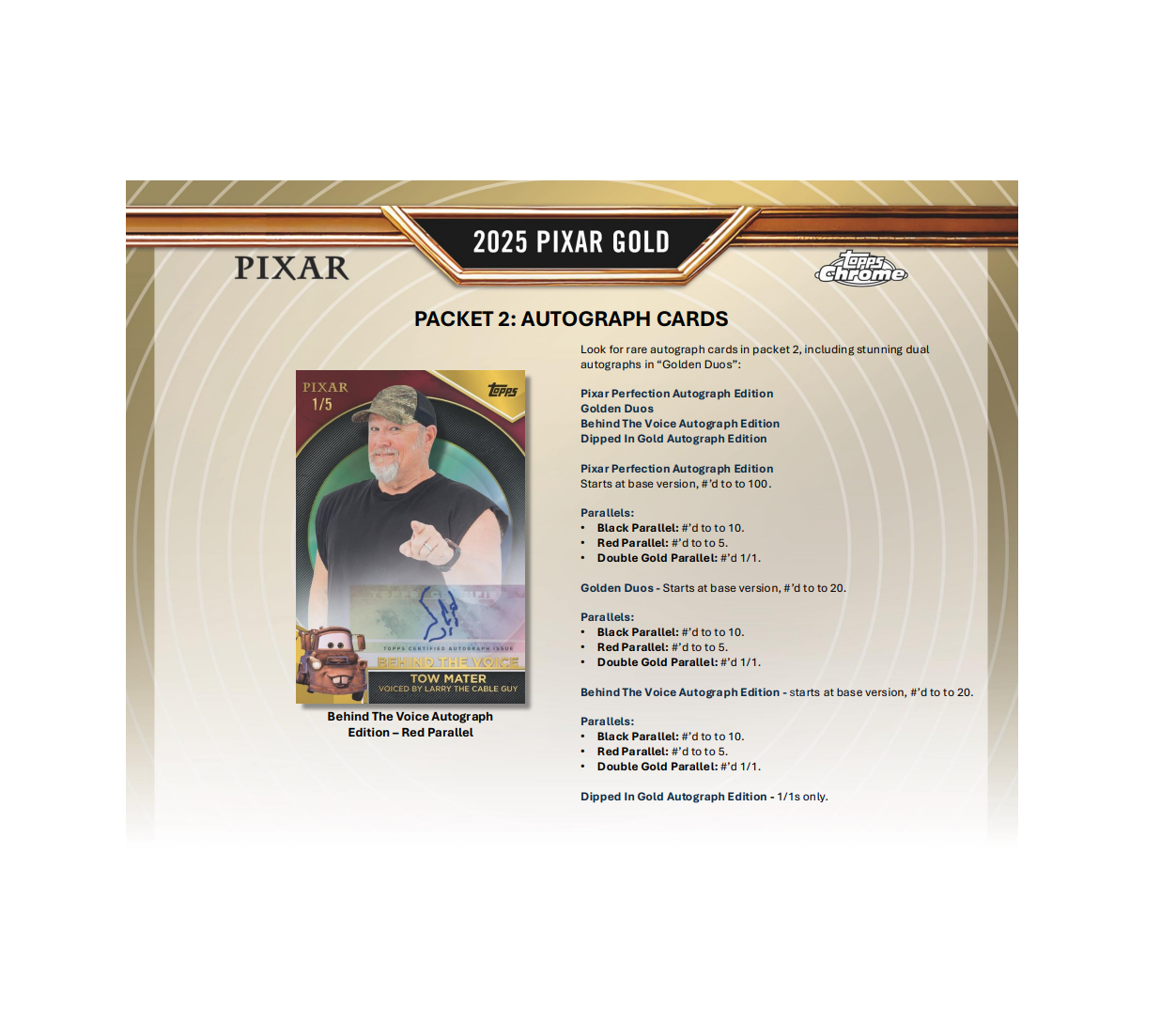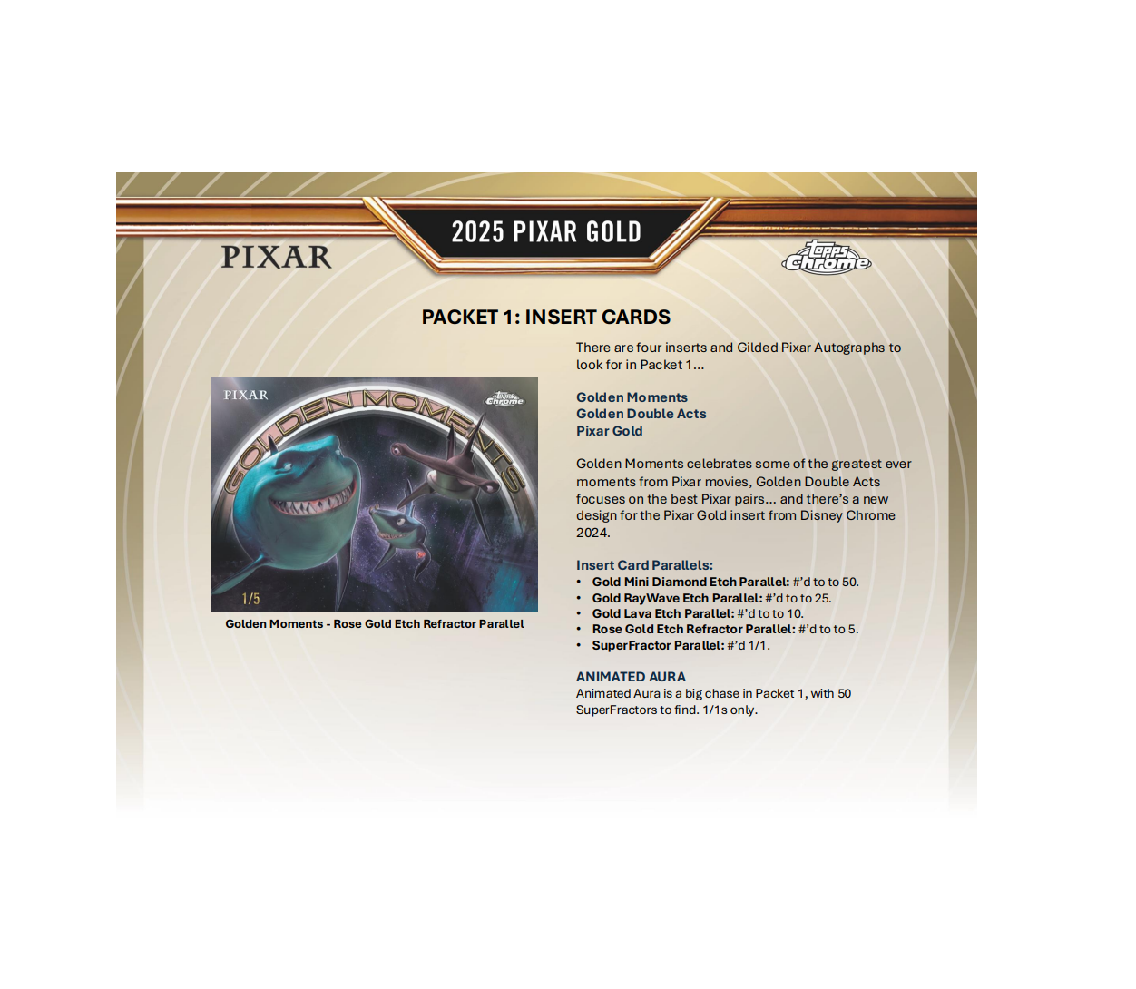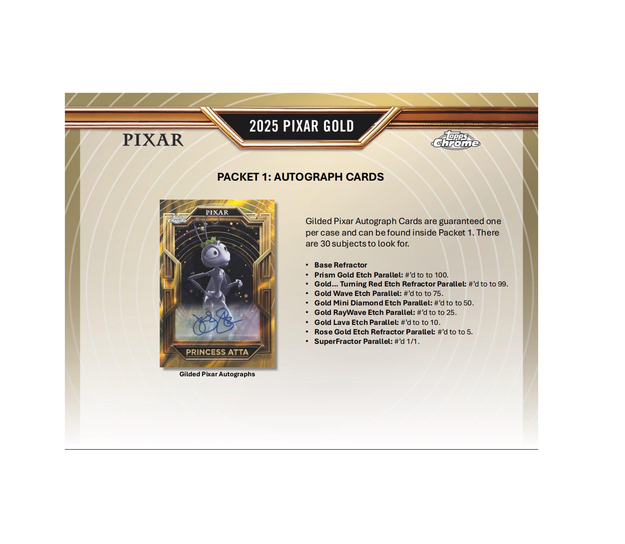 Chase the gold standard with a 2025 Topps Pixar Gold Hobby Box! Find 1 Premium Encased Card (Autograph or rare insert), 2 Golden Moments, 1 Golden Double Acts insert, and 1 Numbered Parallel in every box. Collect the 100-card Gilded Pixar Chrome base set and hunt for 1/1 "Dipped In Gold" cards