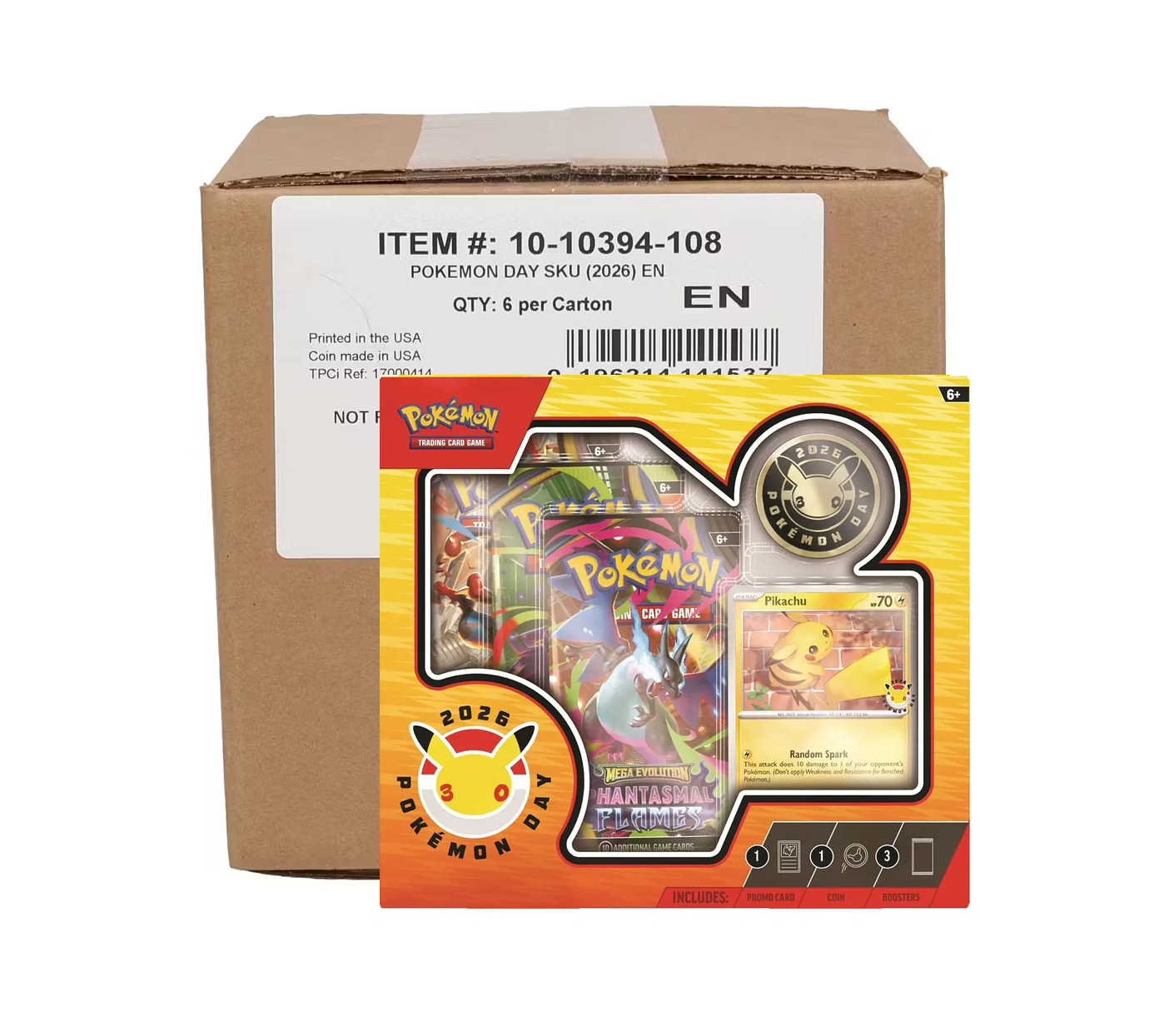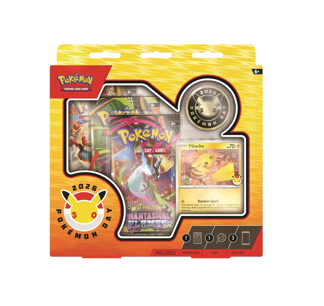 Celebrate with a specially stamped foil promo card featuring Pikachu and a metallic coin featuring the 30th anniversary logo, plus three booster packs from different Pokémon TCG expansions.