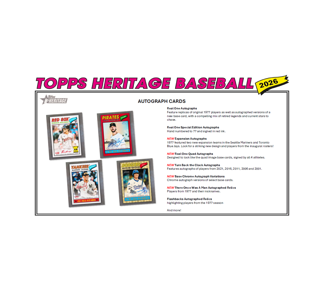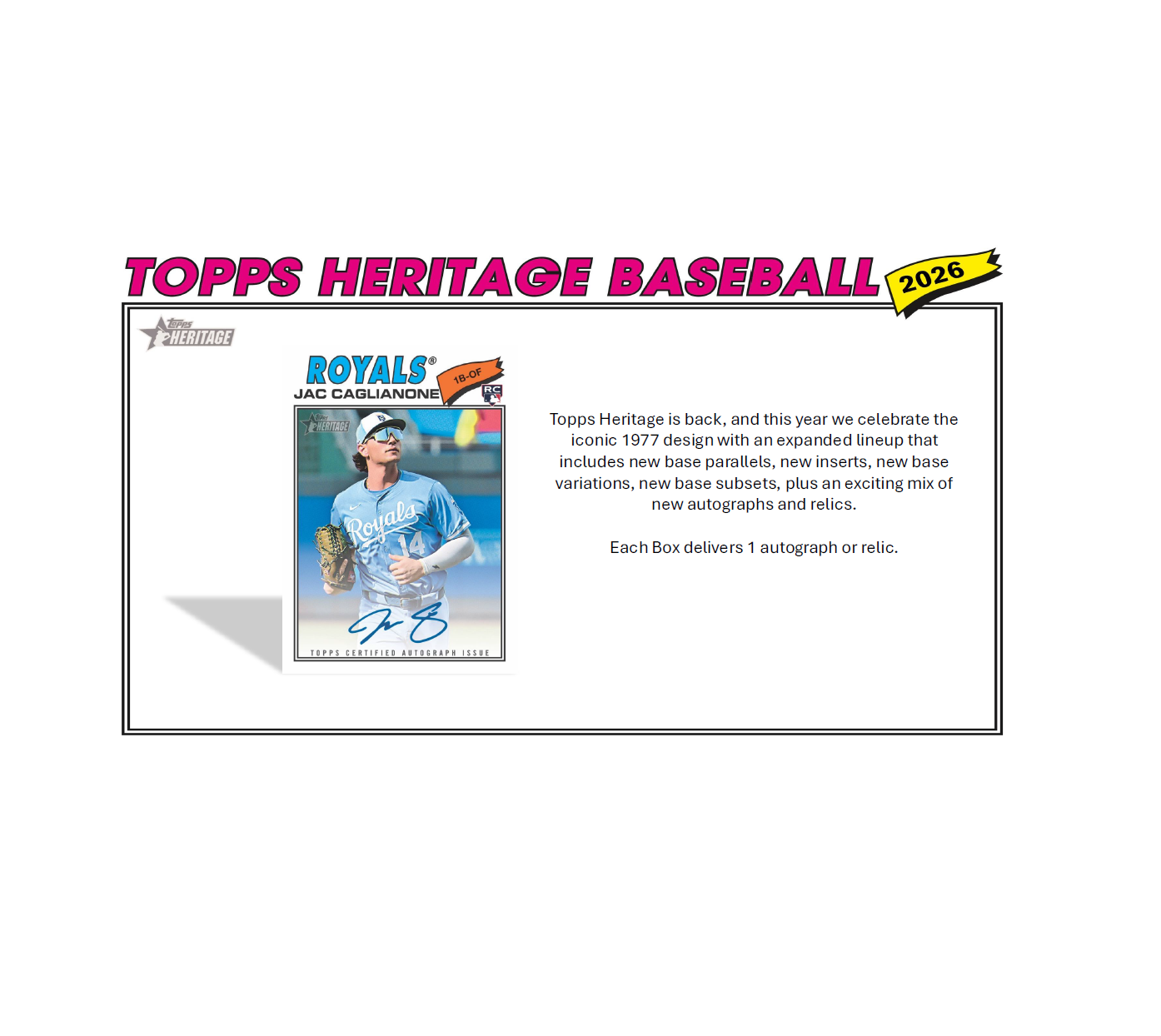 Topps Heritage returns in 2026 to celebrate the iconic 1977 design, bringing the look and feel of a classic era to today’s biggest stars, rookies, and legends. Built for set builders and dedicated Collectors, Heritage continues its tradition of honoring the past while delivering the thrill of the modern chase. Heritage is where generations meet. Rip into 1977 and build your legacy, one card at a time.