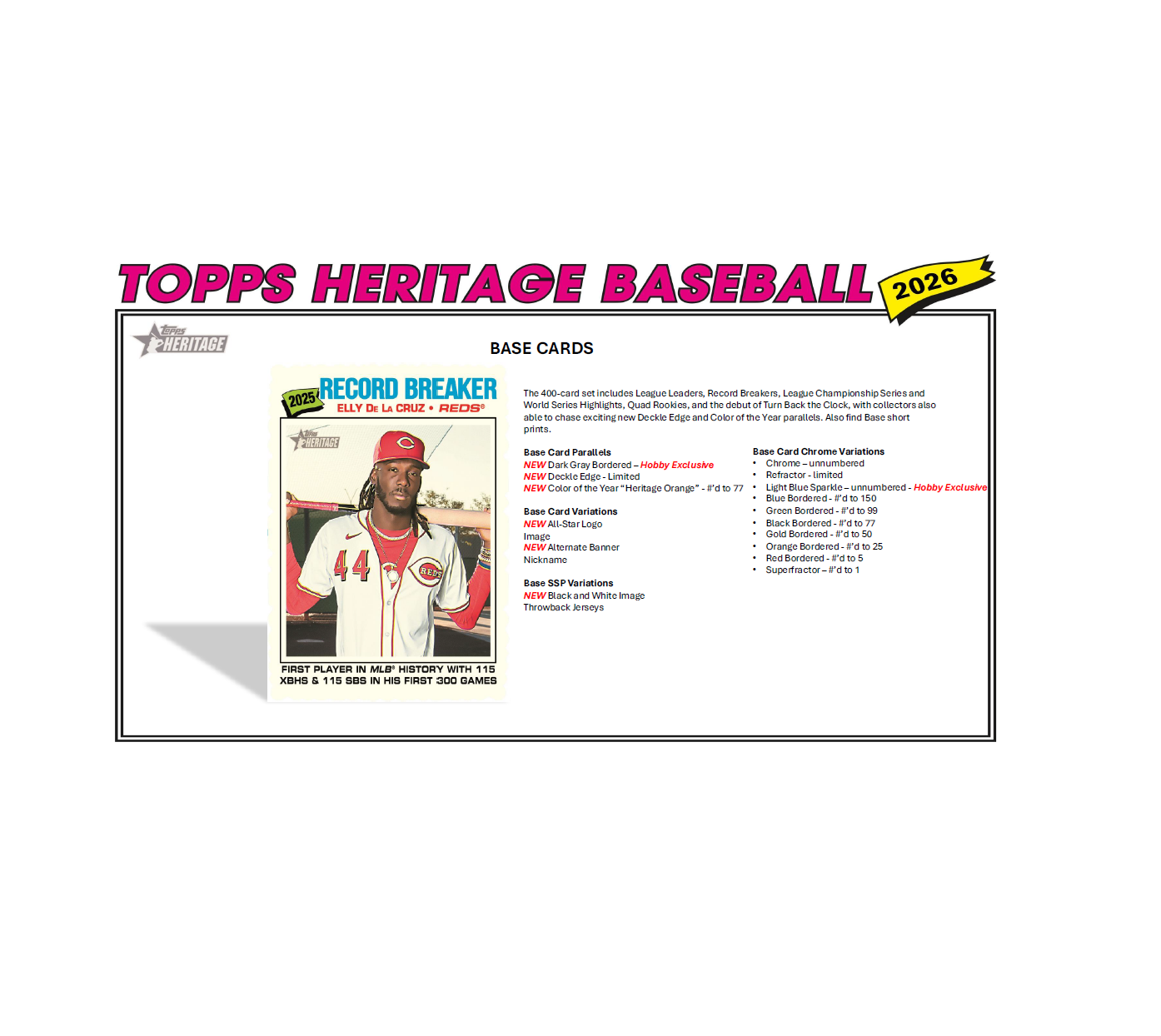 The 400-card base set features League Leaders, Record Breakers, LCS and World Series highlights, Quad Rookies, and the debut of Turn Back the Clock. Chase new parallels including Deckle Edge and the Color of the Year “Heritage Orange” numbered to 77, along with a deep lineup of short prints and variations.
