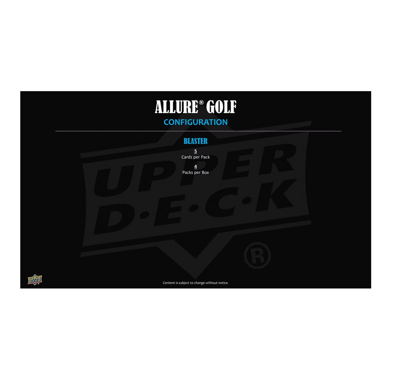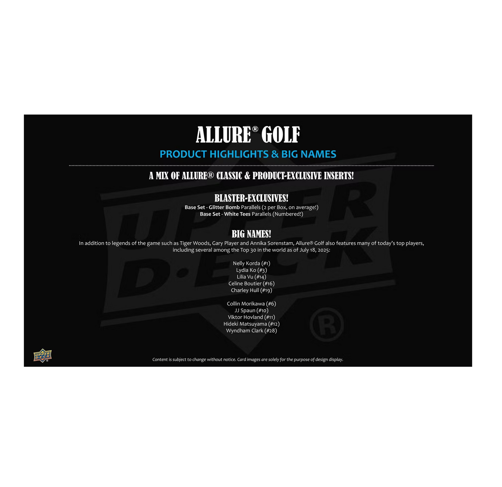 • The first standalone Allure® Golf product features a 60-card Base Set consisting of 40 veterans and legends, and 20 rookies